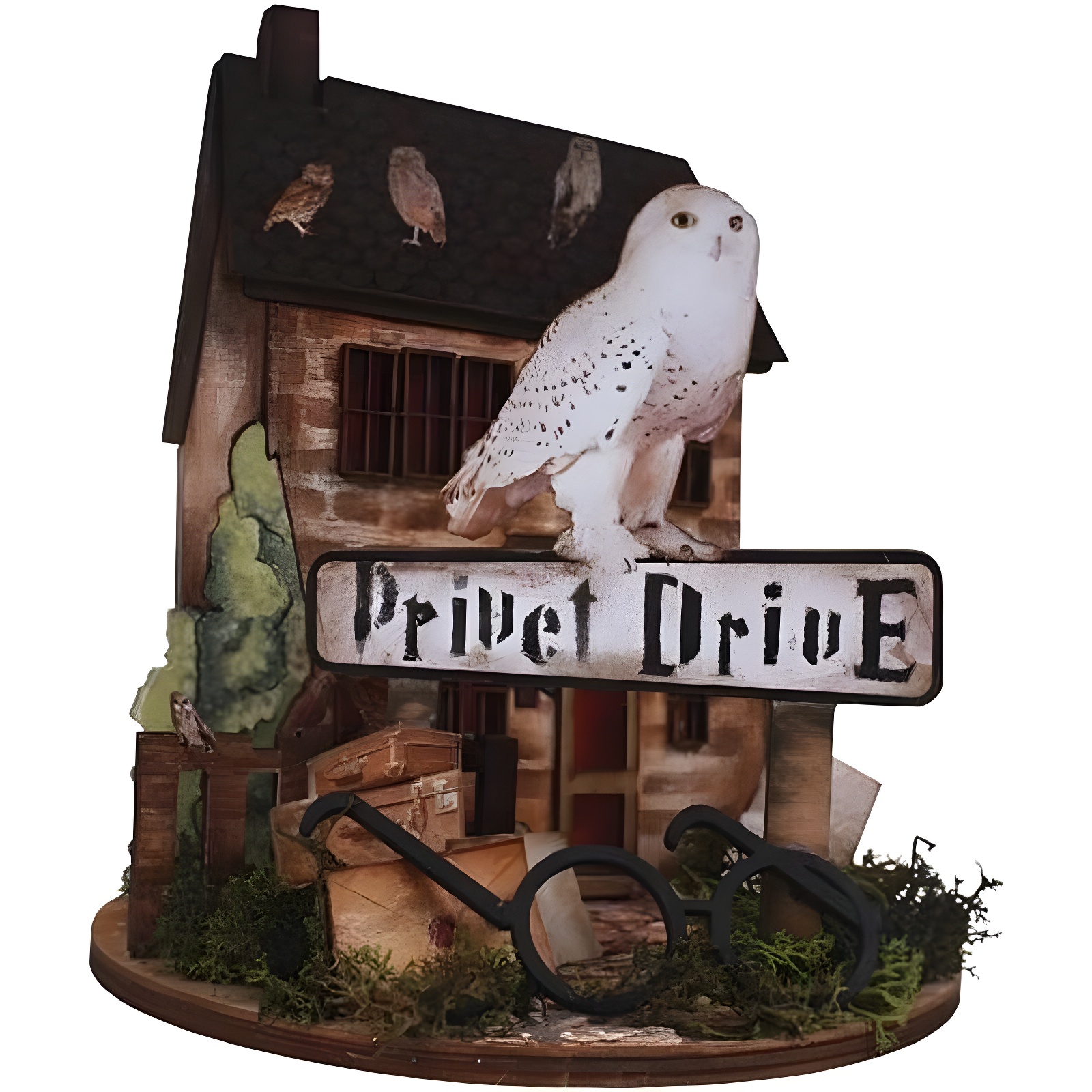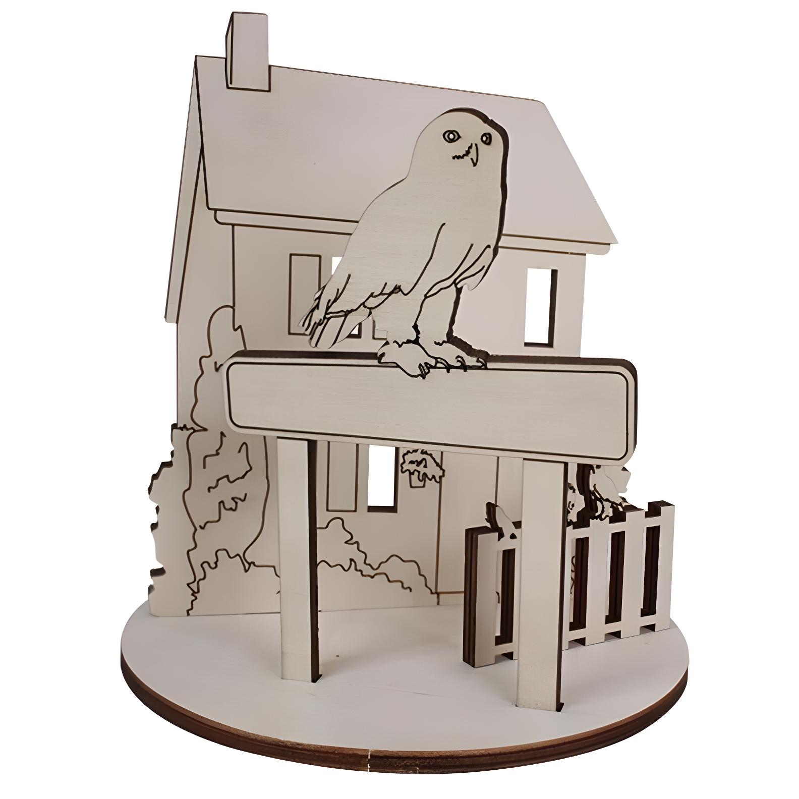 - Scène représentant une maison avec panneau et chouette, issue de la collection « École de Magie ».