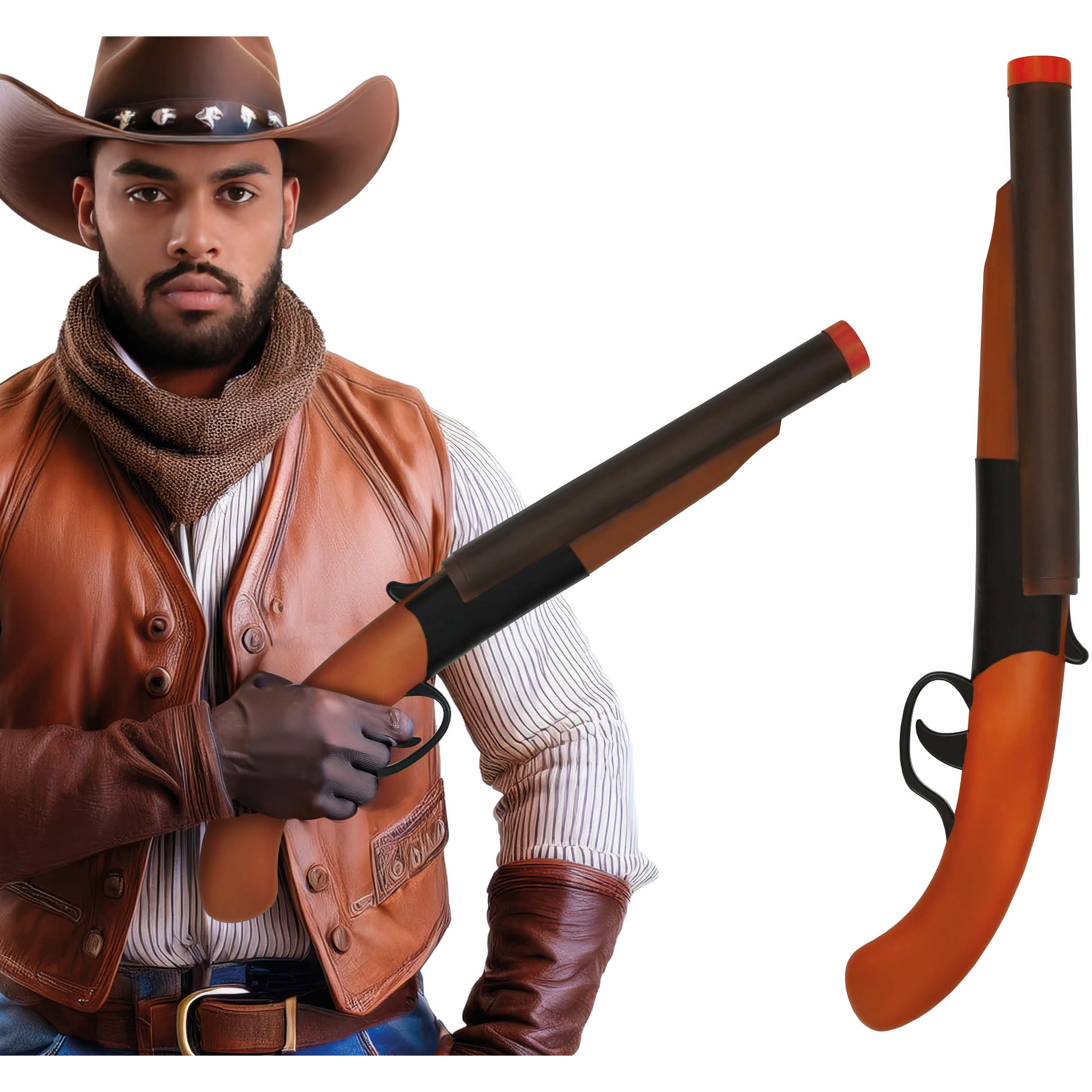 Fusil jouet idéal pour compléter un déguisement style western et renforcer l'ambiance de vos fêtes. Il propose un effet de recul réaliste qui ajoute du réalisme sans utiliser de pièces dangereuses. Conçu en PVC léger, il garantit une manipulation confortable lors de célébrations, défilés et séances photo. Parfait pour le Carnaval, les photocalls et les fêtes à thème lorsque vous souhaitez un accessoire à la fois voyant et sûr.