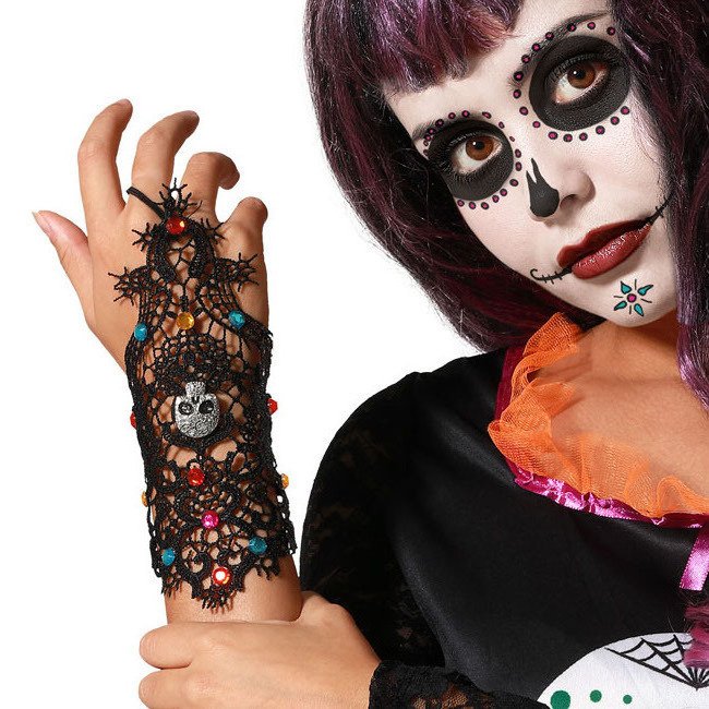 • Gant en résille noire avec une calavera métallique et des pierres multicolores. Idéal pour des déguisements de Catrina ou de la mort mexicaine.
