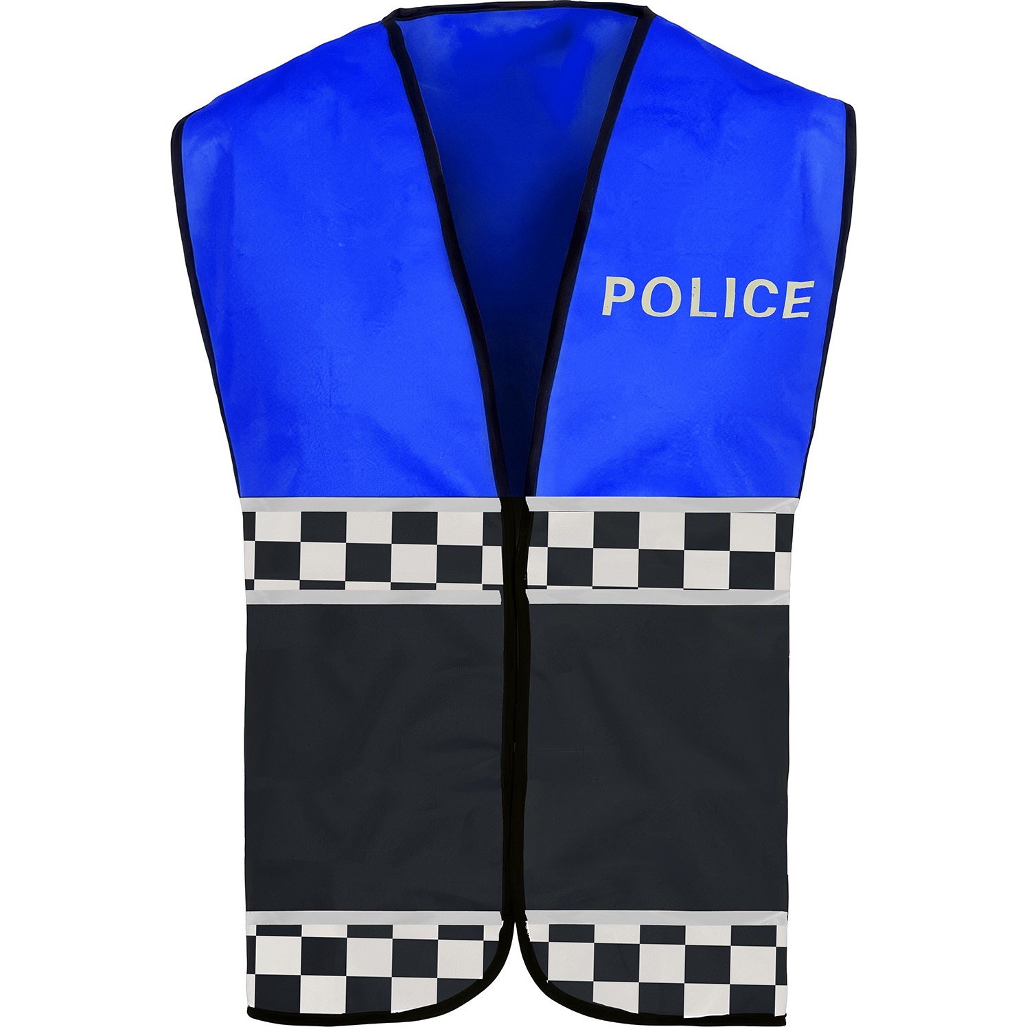 Gilet de police pour enfant, conçu pour les déguisements et les jeux de rôle. Il présente un design bleu avec une bande à damier et l'inscription "POLICE" pour un rendu reconnaissable et ludique.