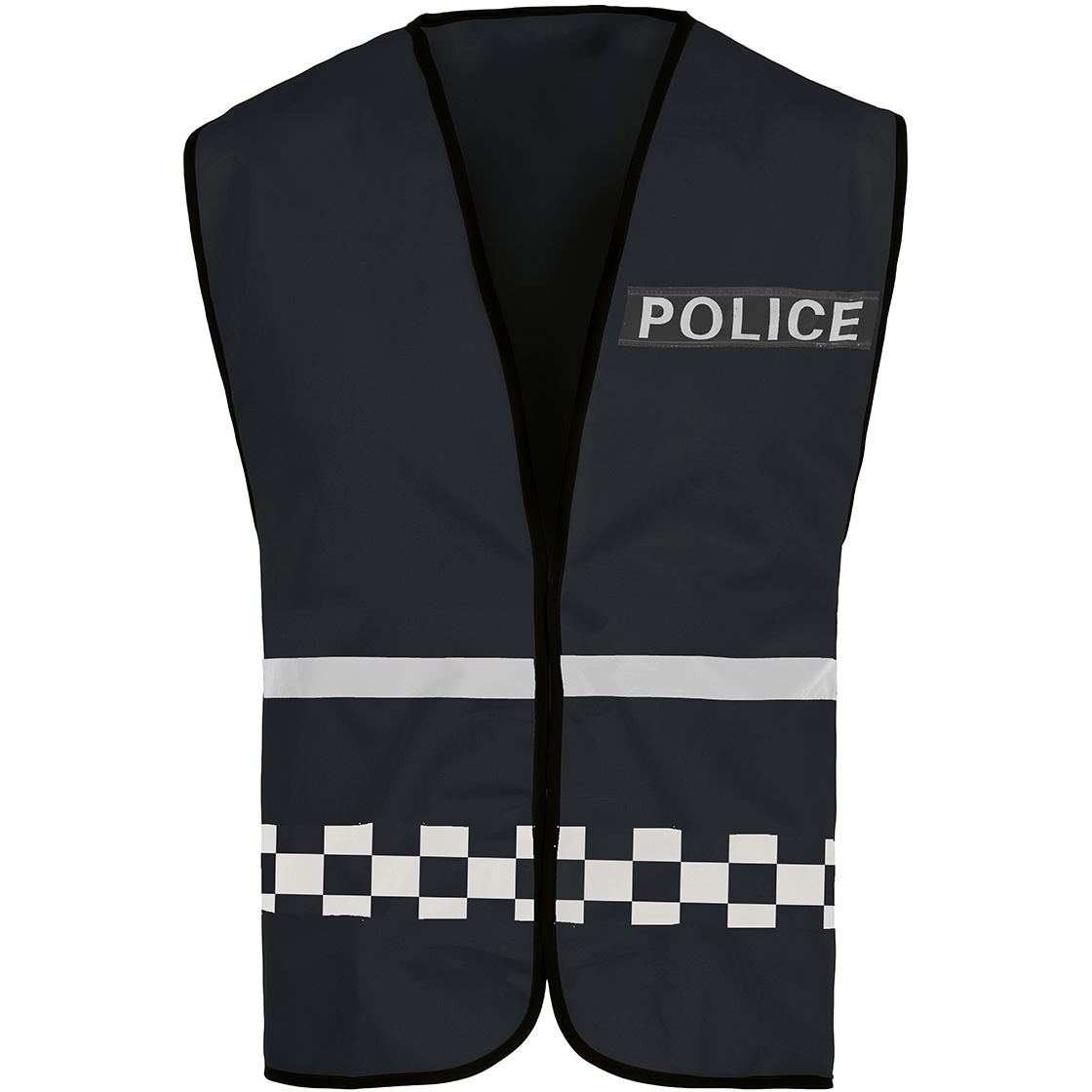Gilet de police noir pour adulte avec l'inscription "POLICE" et bandes réfléchissantes offrant un aspect réaliste. Confectionné en polyester léger, il allie confort et tenue pour compléter n'importe quel look policier. Sans manches, avec ouverture frontale pour le porter aisément par-dessus vos vêtements. Parfait pour les fêtes, carnavals et événements à thème où vous souhaitez un accessoire authentique et facile à utiliser.