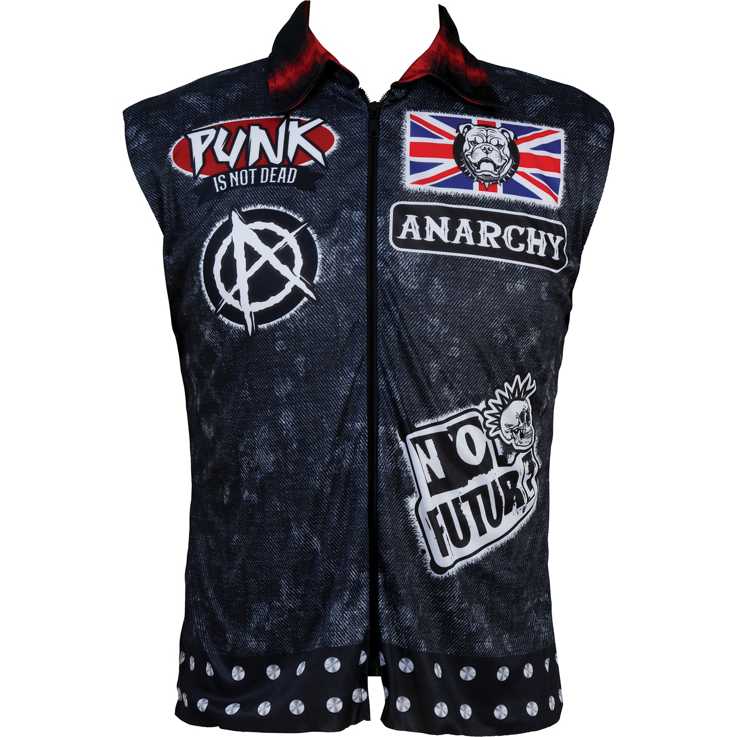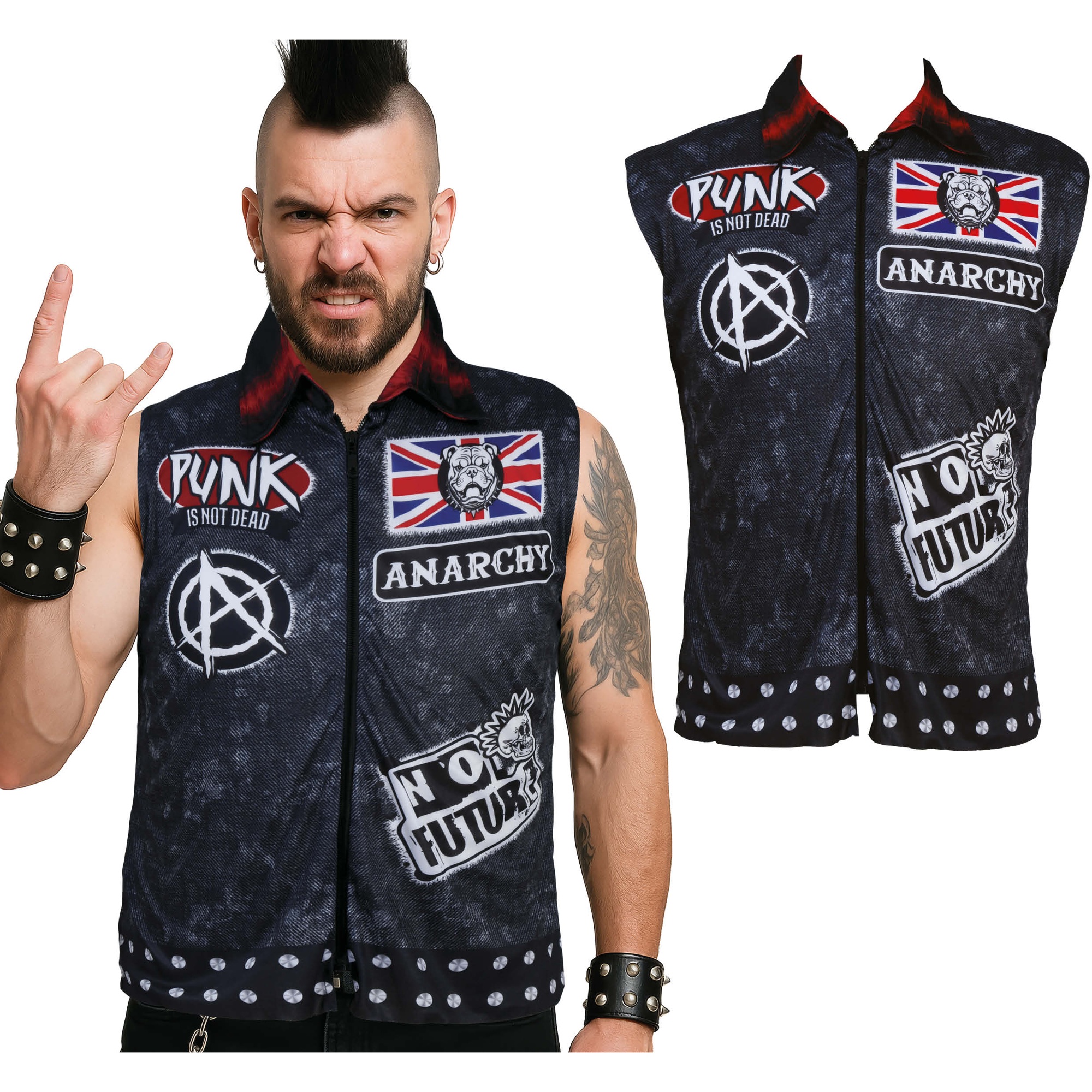 Gilet sans manches à l'esthétique punk et à l'effet usé, conçu pour compléter toute tenue rock. Confectionné en polyester, il offre légèreté et résistance pour être porté sur un t-shirt ou comme pièce de déguisement. Il est doté d'une fermeture zippée sur le devant et d'imprimés à thématique anarchie: "PUNK is not dead", "ANARCHY", "NO FUTURE" ainsi qu'un drapeau britannique orné d'un bulldog. Coupe adulte et confortable, pensé pour apporter une touche rebelle et authentique à votre tenue.