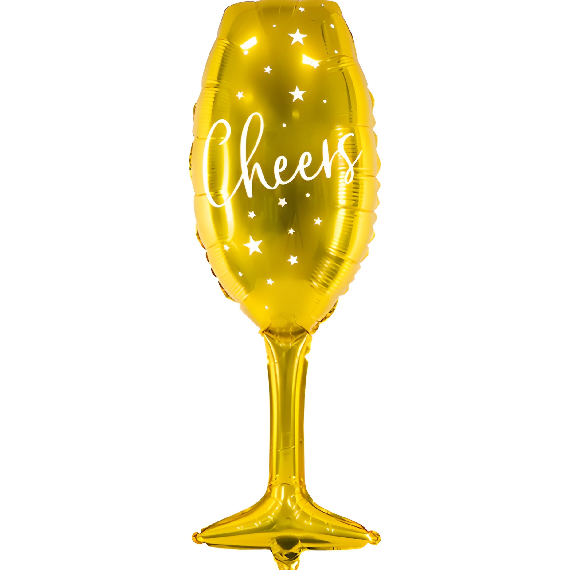 Fabriqué en papier aluminium, ce ballon XL se caractérise par sa forme de coupe en couleur dorée, avec l'inscription ‘Cheers’ en anglais et un fond de nuage d'étoiles blanches. Il peut être gonflé avec de l'air, bien que nous recommandions l'hélium, car cela lui permettra de maintenir sa position naturelle.