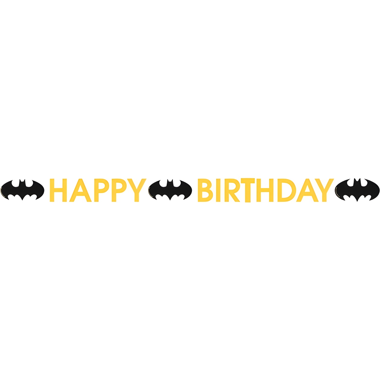 Guirlande décorative portant l'inscription « HAPPY BIRTHDAY » et le logo iconique de Batman, conçue pour habiller les anniversaires d'enfants.