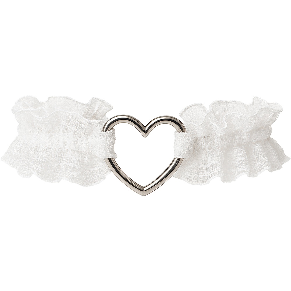 Jarretière élégante en dentelle blanche, agrémentée d'un délicat ornement en forme de coeur métallique.