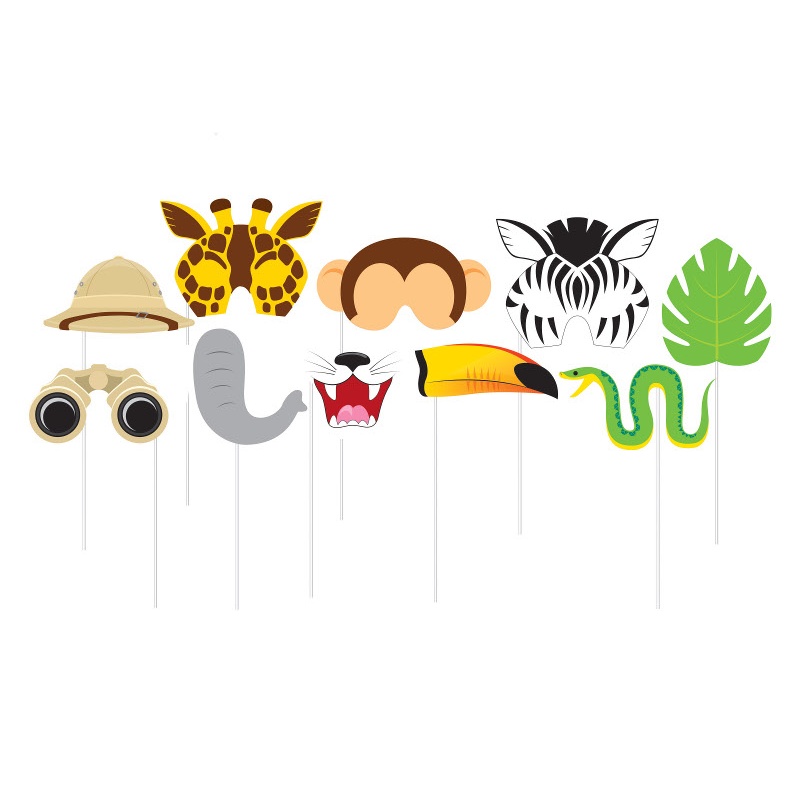 Paquet de 10 unités d'accessoires sur le thème de la jungle sauvage représentant des animaux et un explorateur. Ils vous seront très utiles pour organiser un photocall amusant pour votre fête et obtenir des photos très divertissantes.