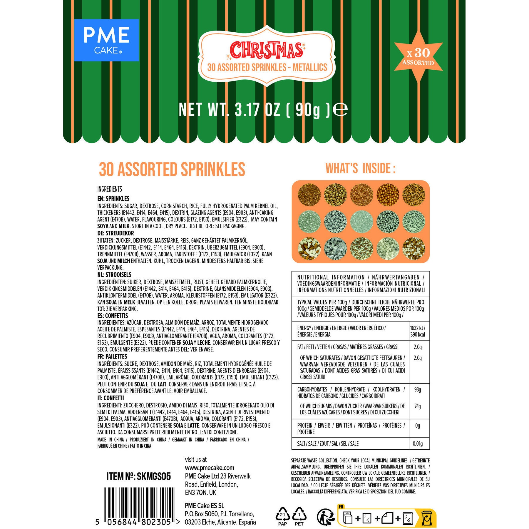 Kit de sprinkles métalliques 30 assortis - PME - 180 gr