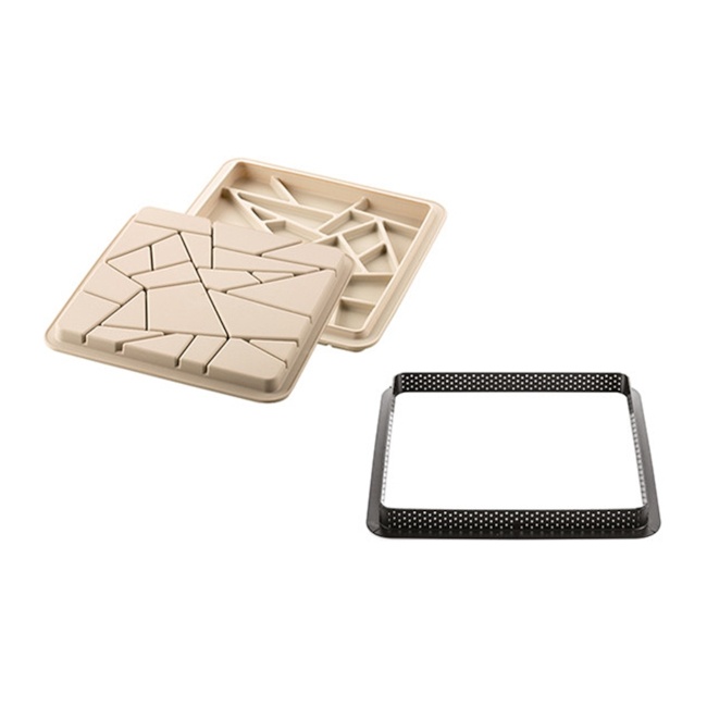 Kit composé d'un moule en thermoplastique indéformable carré pour réaliser la base de la tarte et d'un autre moule en silicone de haute qualité pour donner une forme originale à la partie supérieure de celle-ci.