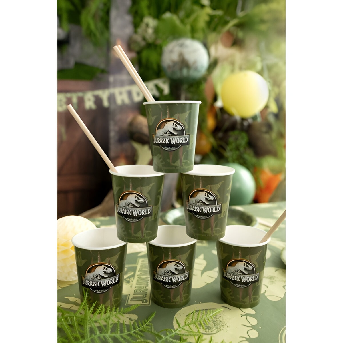 Gobelets jetables au design officiel Jurassic World, couleur verte avec imprimé dinosaure. Capacité approximative 250 ml (8,5 oz) et hauteur d'environ 9 cm. Conçus pour les fêtes d'enfants, faciles à utiliser et à jeter. Non adaptés aux boissons chaudes. Contiennent les marquages requis par le règlement (UE) 2020/2151 et des étiquettes d'information en polonais, espagnol, letton, estonien, portugais, hongrois, grec, croate et roumain.