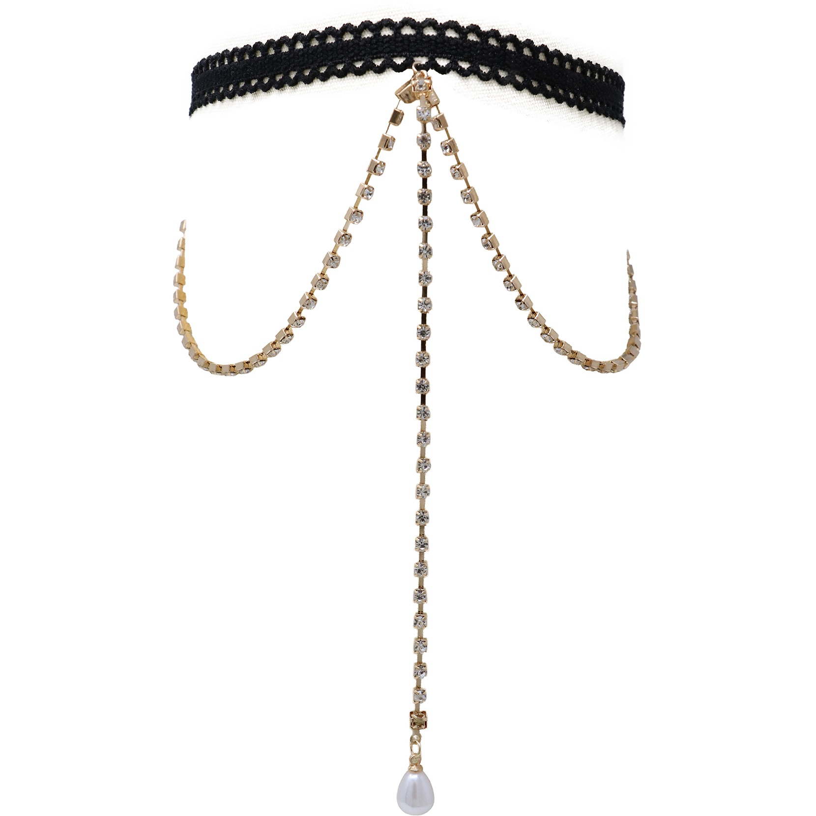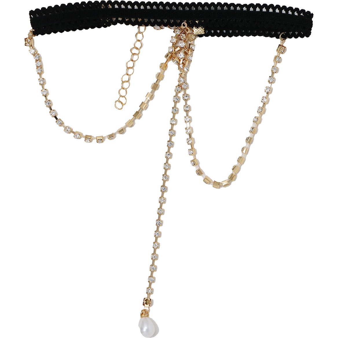 Elle se compose d'une bande de dentelle noire et de chaînes ornées de strass imitation, agrémentées d'un pendentif perle pour une finition sophistiquée.