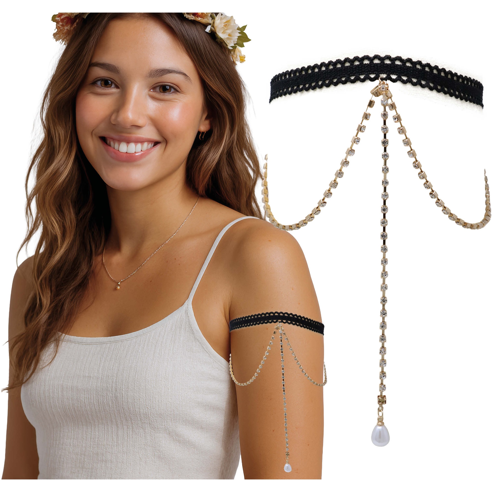 - Style bohème-chic: dentelle noire et chaînes drapées qui subliment le bras d'une touche romantique.