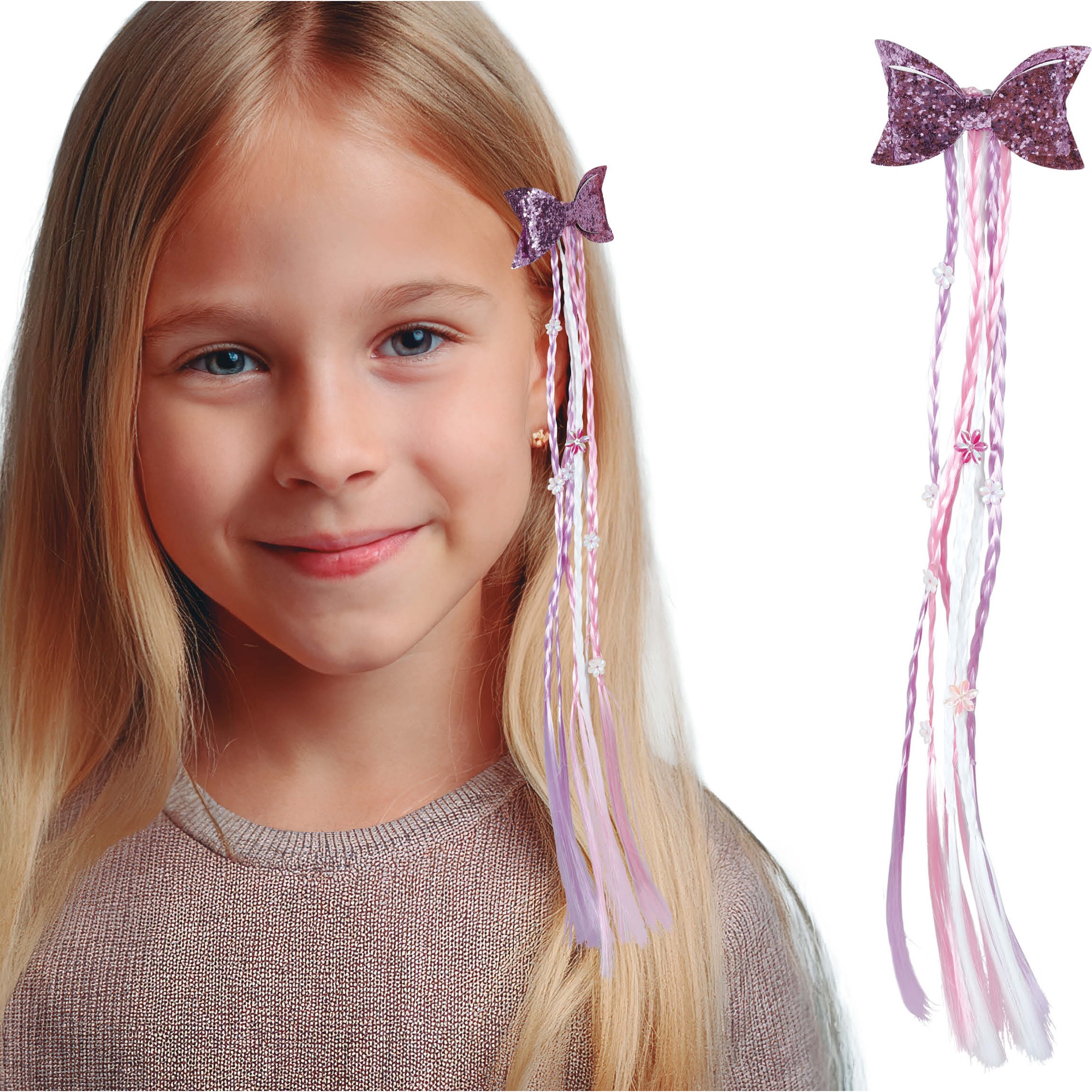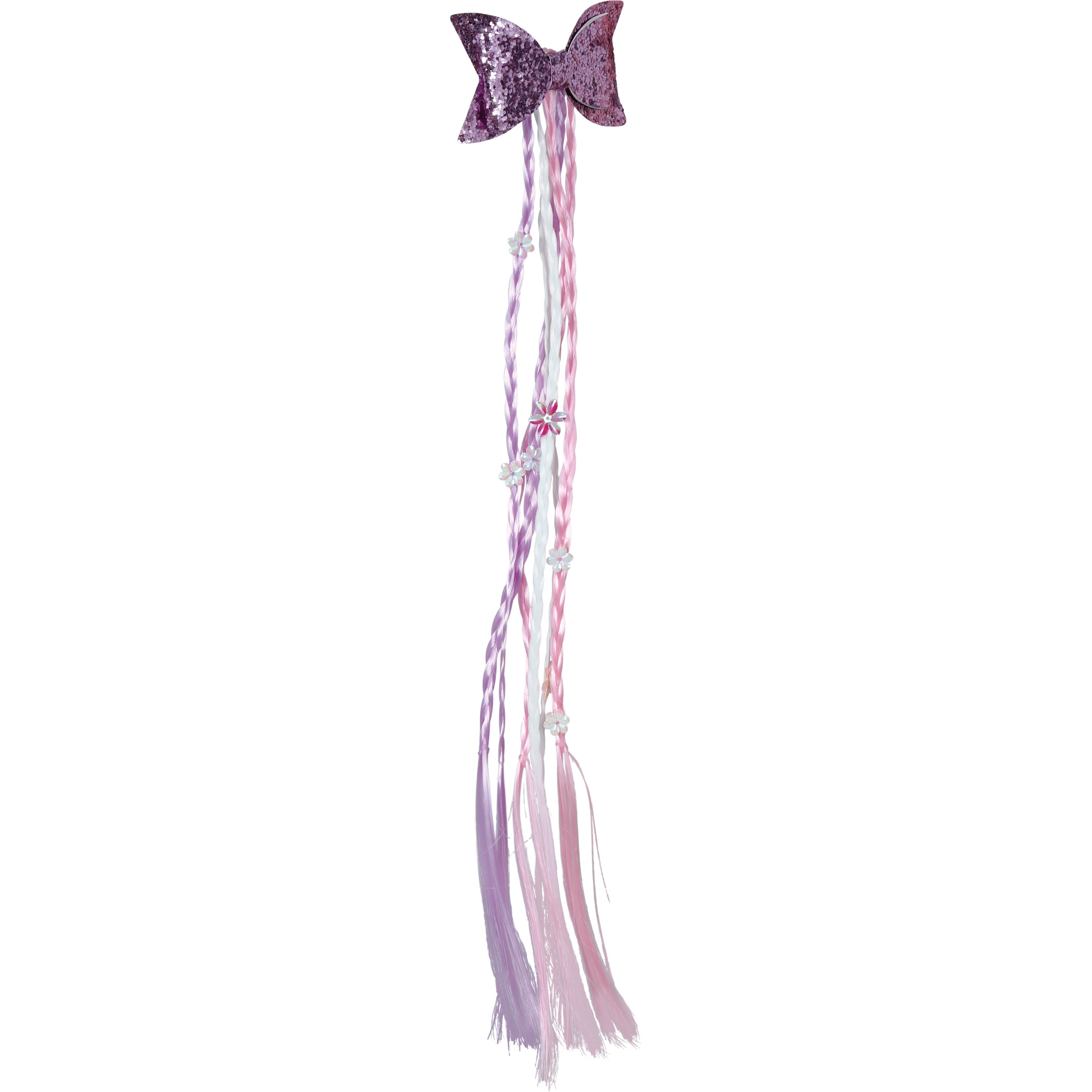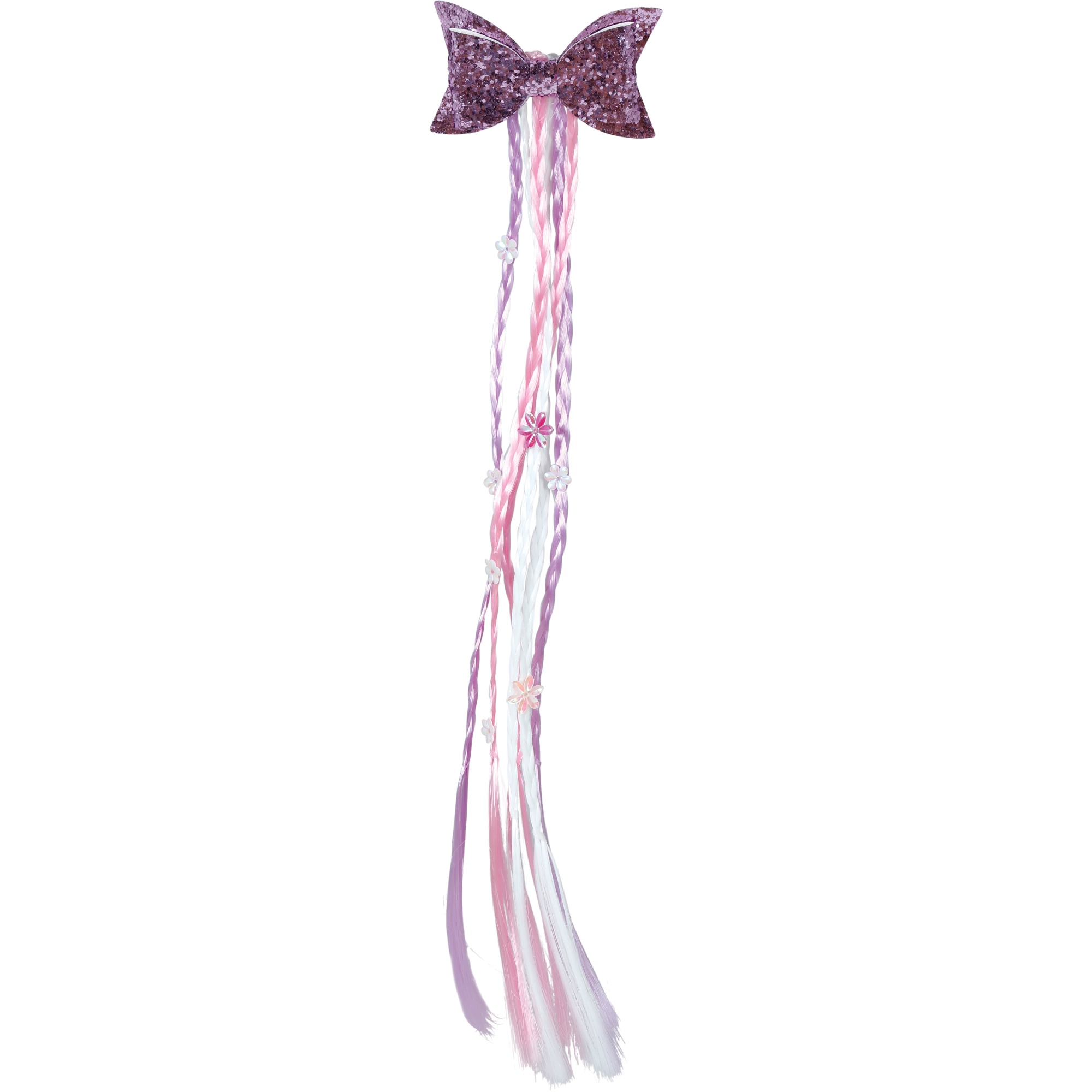 Mèche tressée aux tons violet et rose avec noeud pailleté, 30 cm de long pour un effet remarqué dans les cheveux.