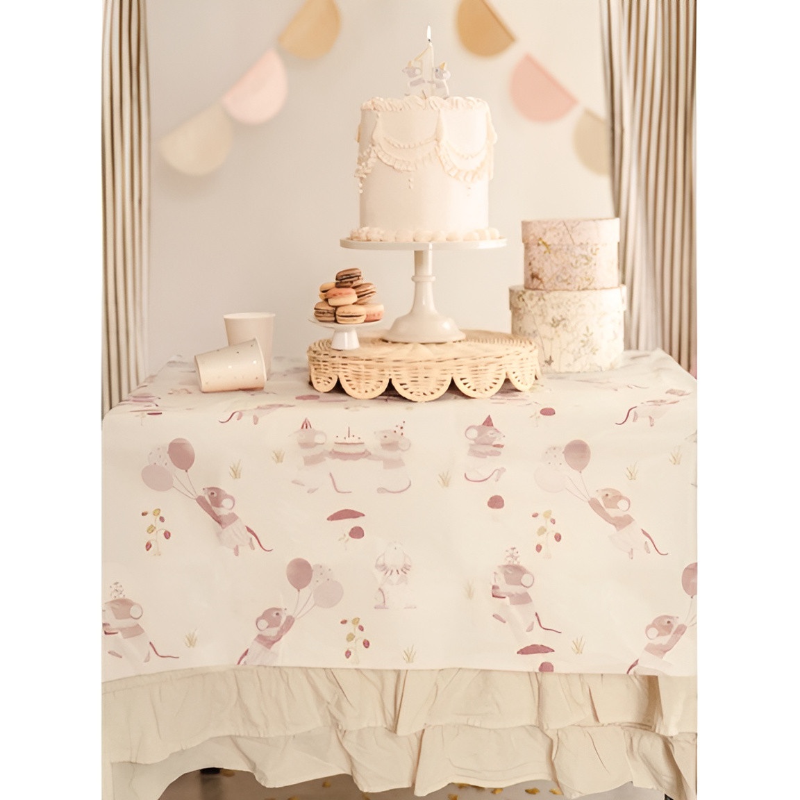 Nappe en papier "Mice" beige au délicat motif de petites souris. Dimensions déployées: 180 x 120 cm. Pensée pour apporter une touche tendre et harmonieuse aux tables d'enfants, elle vous permet de décorer facilement et de ranger rapidement après l'événement. Son rendu neutre s'accorde avec de nombreux styles et couleurs, tandis que sa finition mate valorise le motif pour une table soignée.