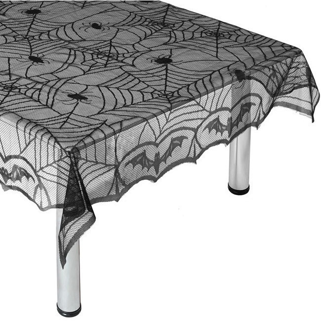 • Nappe en dentelle noire avec des motifs de toiles d'araignées, de chauves-souris et d'araignées.