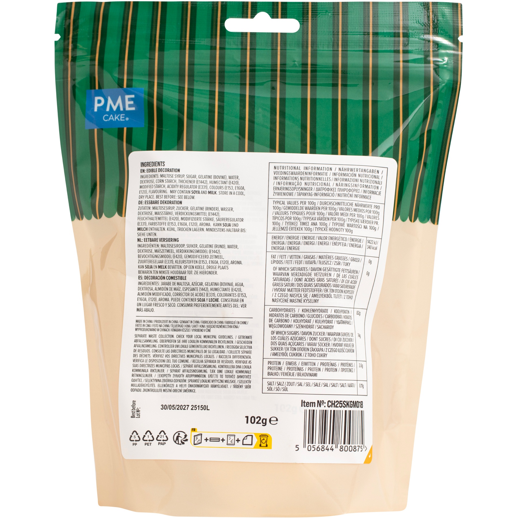 Ingrédients: sirop de maltose, sucre, gélatine (bovine), eau, dextrose, amidon de maïs, épaississant (1442), humectant (E420), amidon modifié, correcteur d'acidité (E331), colorants (E153, E160A, E120), arôme.