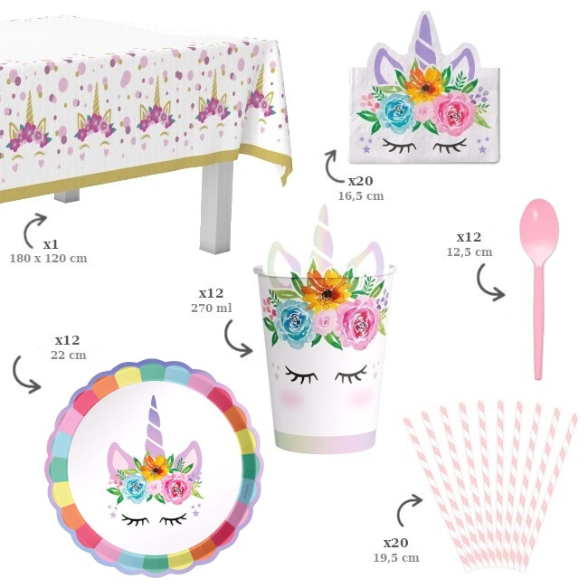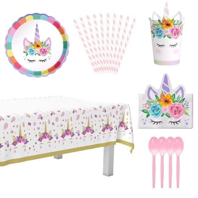 Il s'agit d'un pack avec tout le nécessaire pour profiter d'une fête sur le thème des licornes.