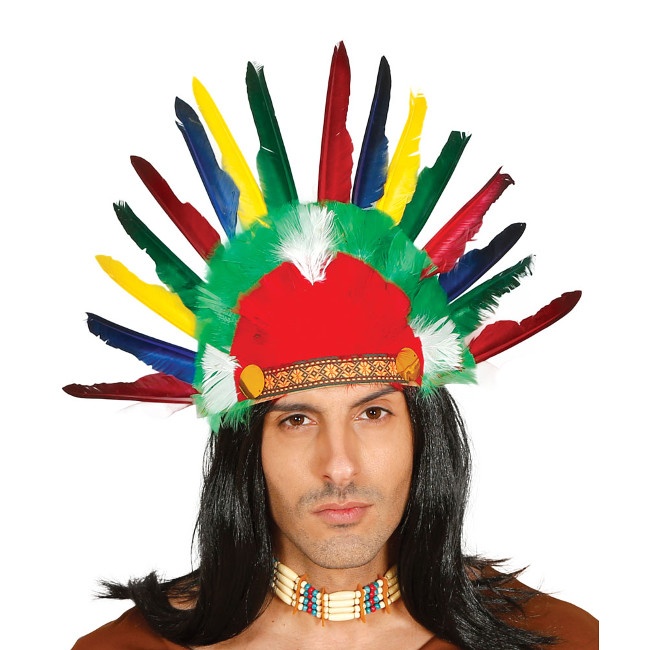 Il s'agit d'une coiffe colorée en plumes, idéale pour le costume d'indien. Elle est dotée d'un bandeau à motifs ethniques sur la partie inférieure et d'une zone centrale semi-circulaire avec des plumes vertes, surmontées de plumes rouges plus courtes de même forme circulaire.