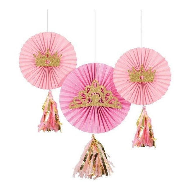 Ensemble de 3 éventails décoratifs dans une délicate couleur rose, avec une couronne au centre et, en guise de touche finale, un pompon brillant, le tout assorti au thème de la fête pour votre princesse. Ces éventails sont parfaits pour décorer tout type d'événement ou de célébration, ils seront magnifiques suspendus ou sur le mur.