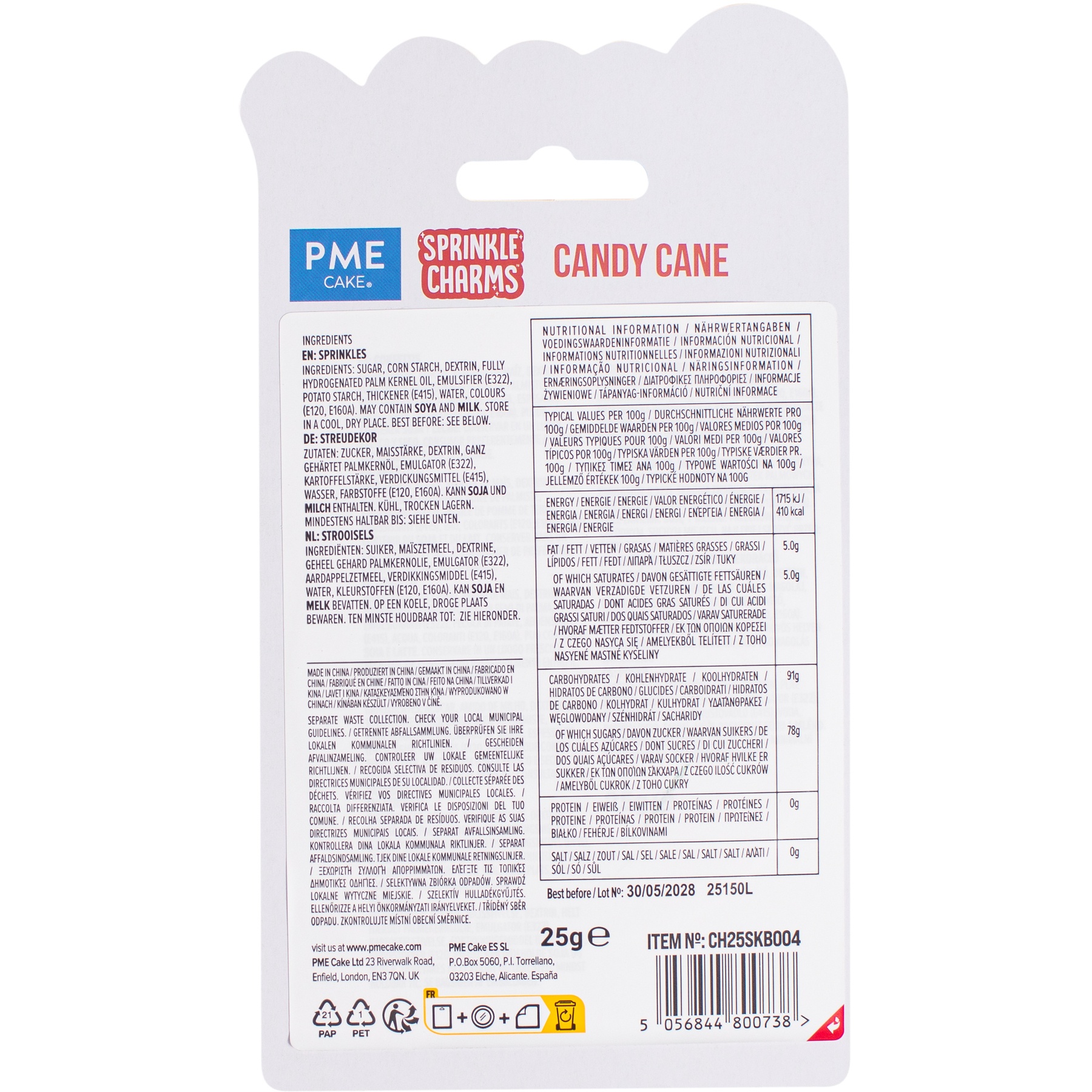 Ingrédients: sucre, amidon de maïs, dextrine, huile de palmiste totalement hydrogénée, émulsifiant (E322), amidon de pomme de terre, épaississant (E415), eau, colorants (E120, E160A).