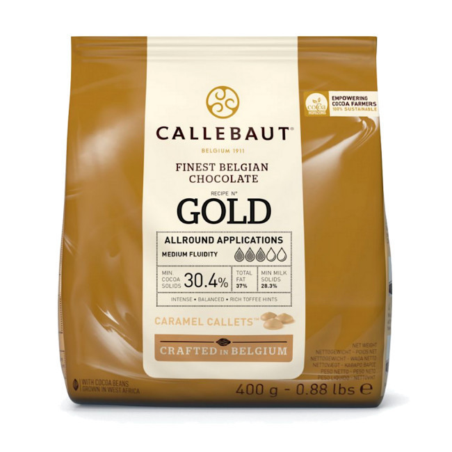 - Callets de chocolat dorés de Callebaut, avec de riches notes de caramel, beurre, crème et une pincée de sel.