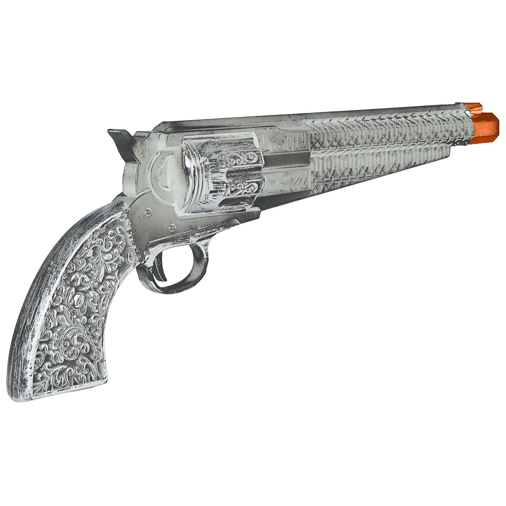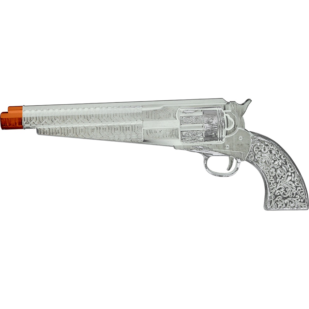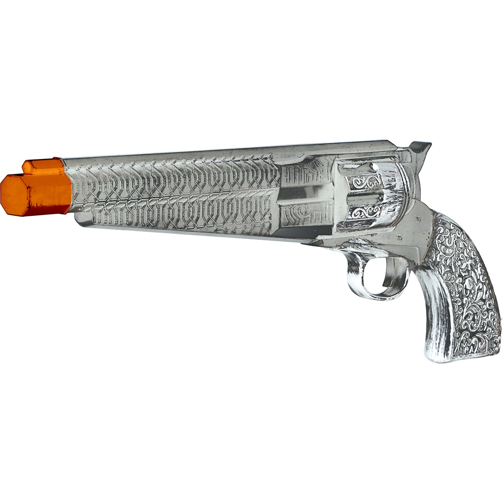 Pistolet jouet au fini argenté et au design classique de cow?boy, conçu pour compléter vos déguisements et vos jeux de rôle. D'environ 30 cm de long, il est fabriqué en PVC léger pour un rendu saisissant sans alourdir votre costume. Il comporte un embout de sécurité orange bien visible pour une utilisation plus sûre lors de fêtes et d'événements.