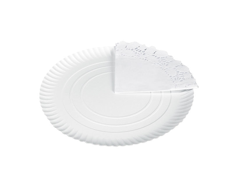 Produit pour décorer la table sous forme de plateau rond en carton avec napperon en papier.
