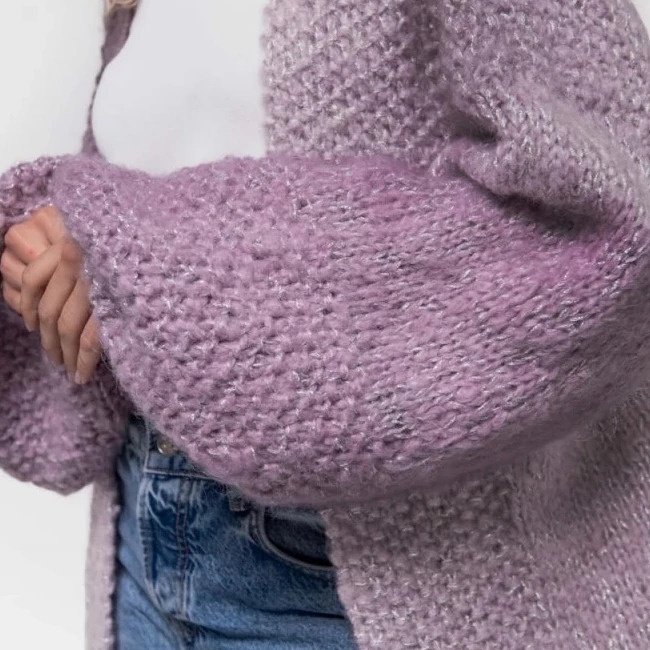 - Cardigan avec haut et poignets en point de riz et manches bouffantes. Niveau de difficulté intermédiaire.
