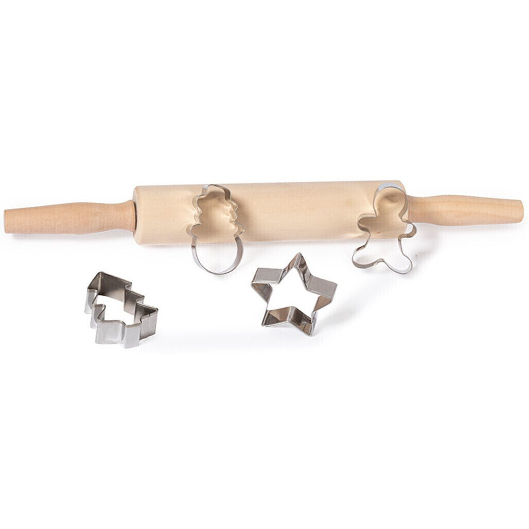 • Comprend un rouleau à pâtisserie et 4 moules en forme de Sapin de Noël, Étoile, Bonhomme de Neige et Bonhomme en Pain d'Épice.