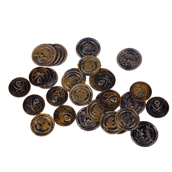Ce sac contient 30 pièces de monnaie sur le thème des pirates en plastique avec un aspect vieilli.