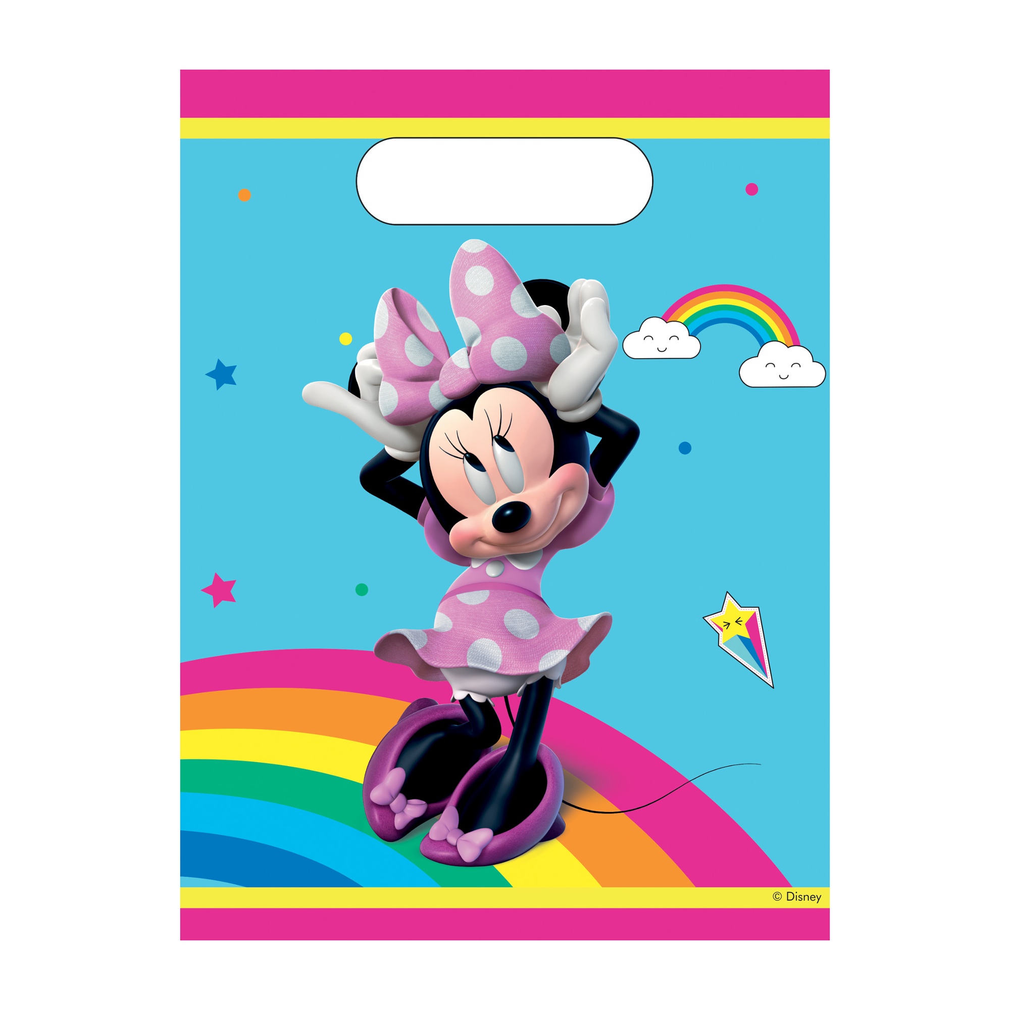 Lot de 6 sacs au motif Minnie Mouse et arc-en-ciel, parfaits pour apporter couleur et gaieté à vos célébrations.