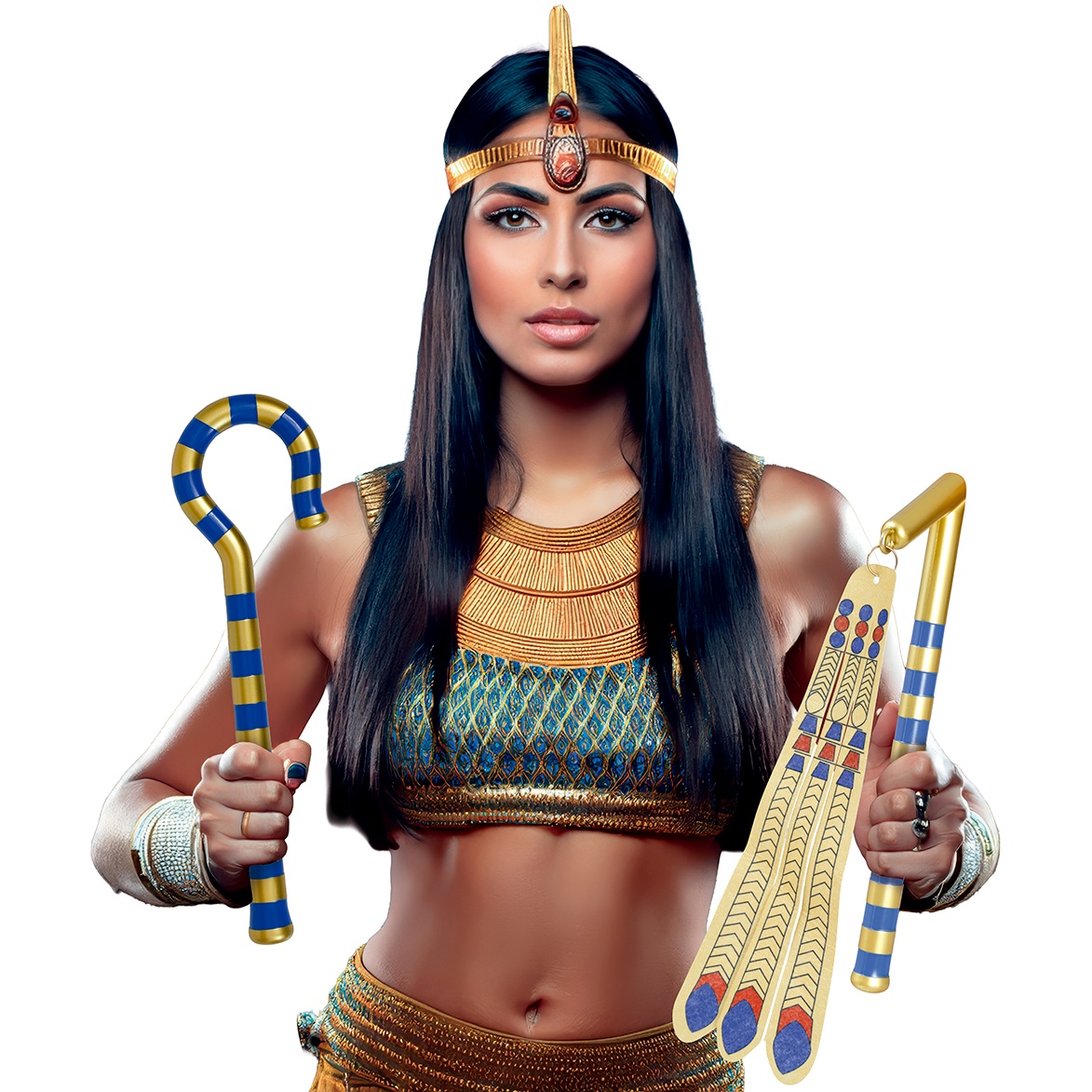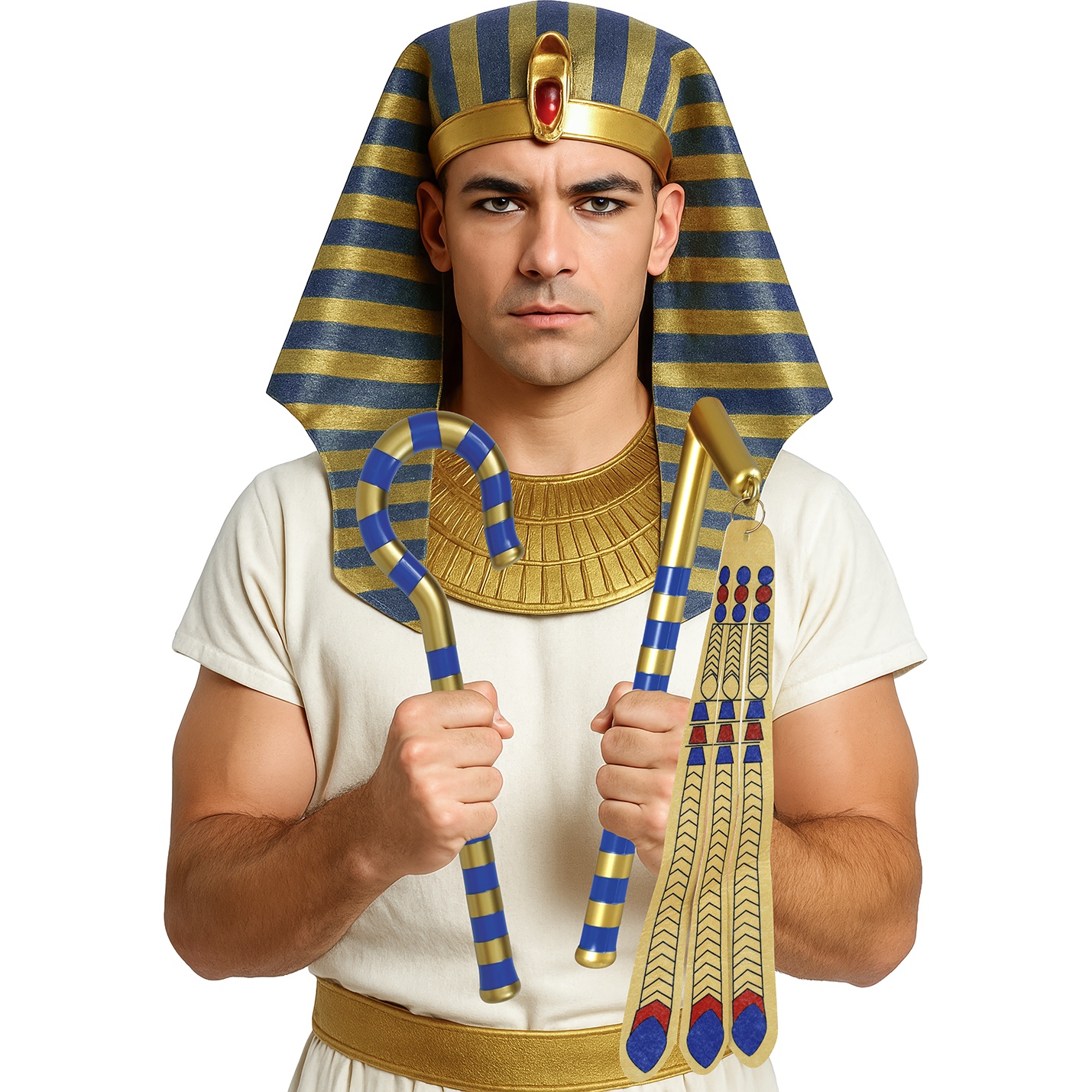 Ensemble d'accessoires inspiré du pharaon égyptien, idéal pour parfaire votre look historique lors du Carnaval et des fêtes à thème. Conçu pour apporter une touche authentique et remarquable grâce aux couleurs traditionnelles doré et bleu. Pièces légères et maniables, pensées pour accompagner votre costume sans compromettre l'impact visuel.