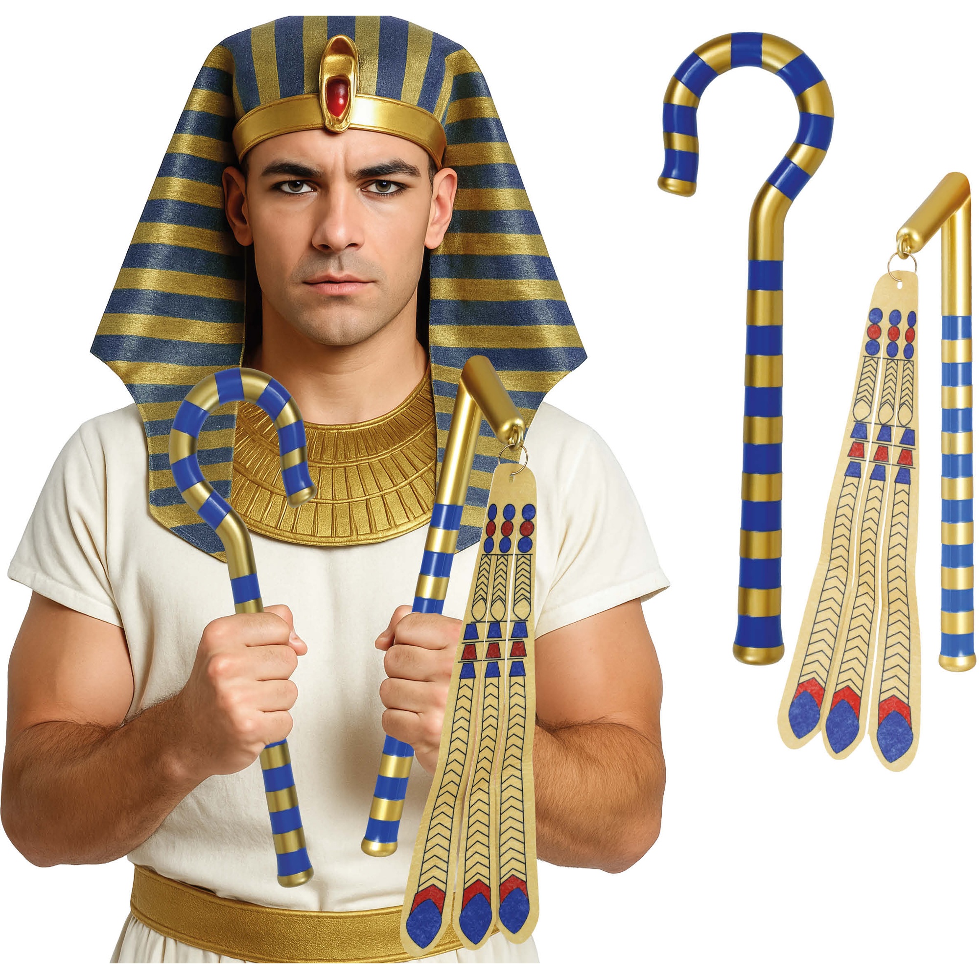 • Ensemble de 2 pièces comprenant le sceptre et le fléau emblématiques du pharaon, idéal pour compléter les costumes égyptiens.