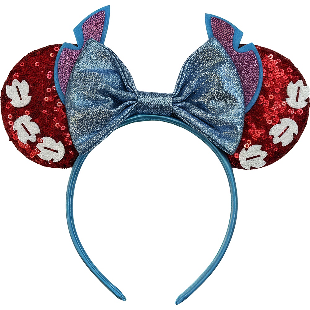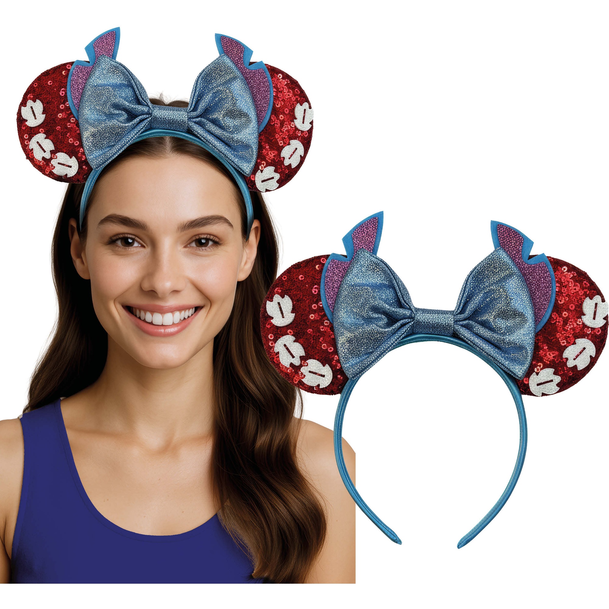 Serre-tête bleu aux oreilles rondes et grand noeud scintillant, inspiré de Minnie.