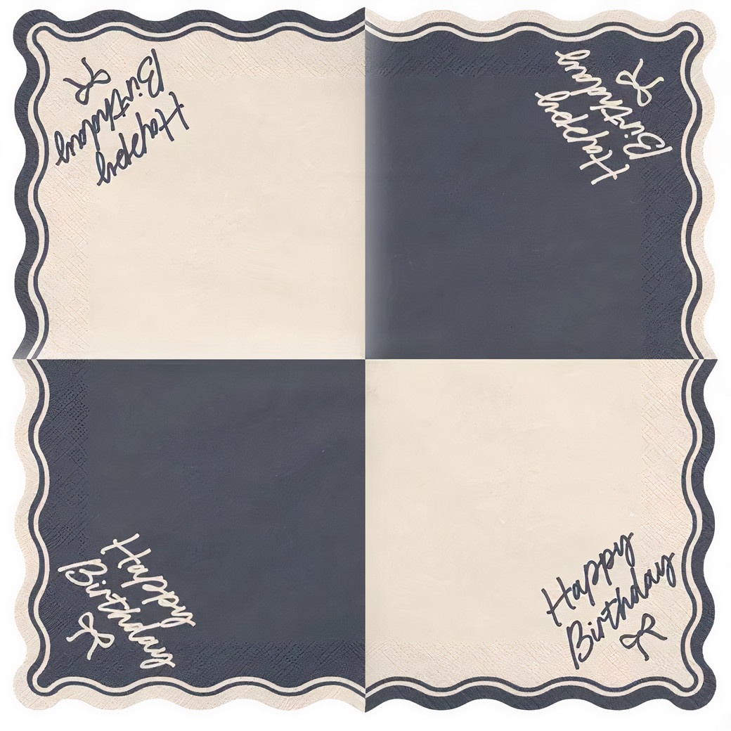 Serviettes en papier 2 plis au design élégant « Happy Birthday Bow », dans des tons beige et noir. Le motif associe une typographie manuscrite à un bord ondulé pour apporter une touche raffinée à votre table. Dimensions dépliées: 33 x 33 cm ; pliées: 16,5 x 16,5 cm. Présentées en paquets pratiques, elles sont idéales pour vos anniversaires et réceptions stylées.