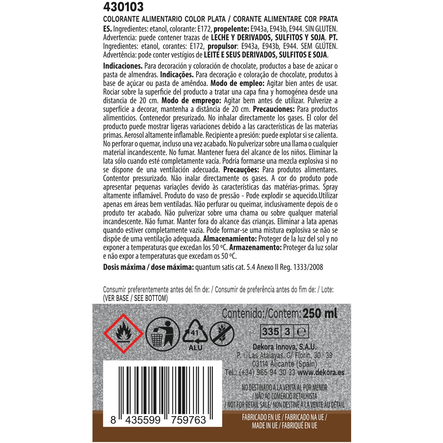 Ingrédients Argenté: Éthanol, propulseur (E943a, E943b, E944), colorants (E172).