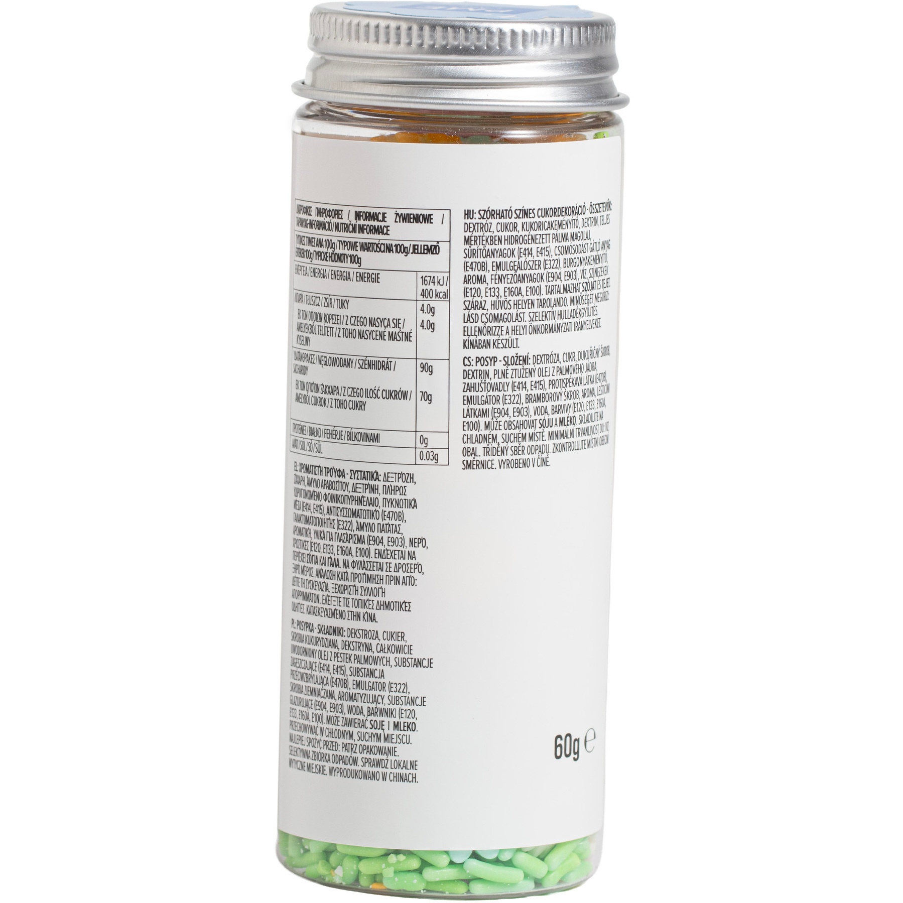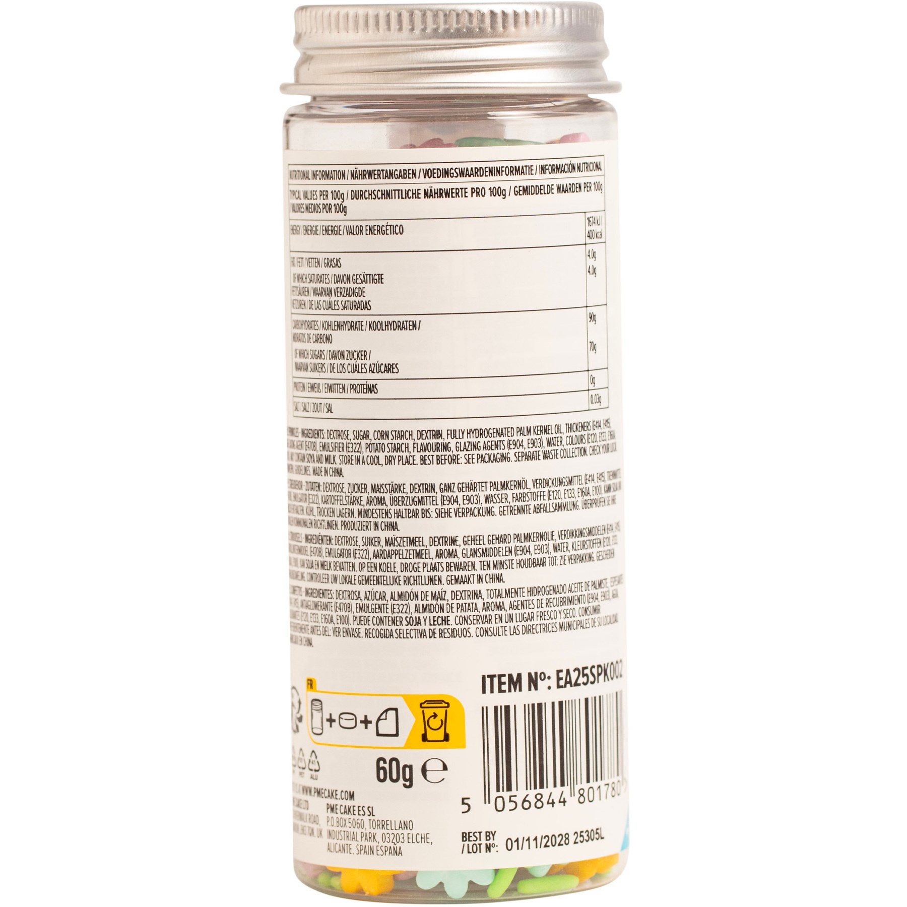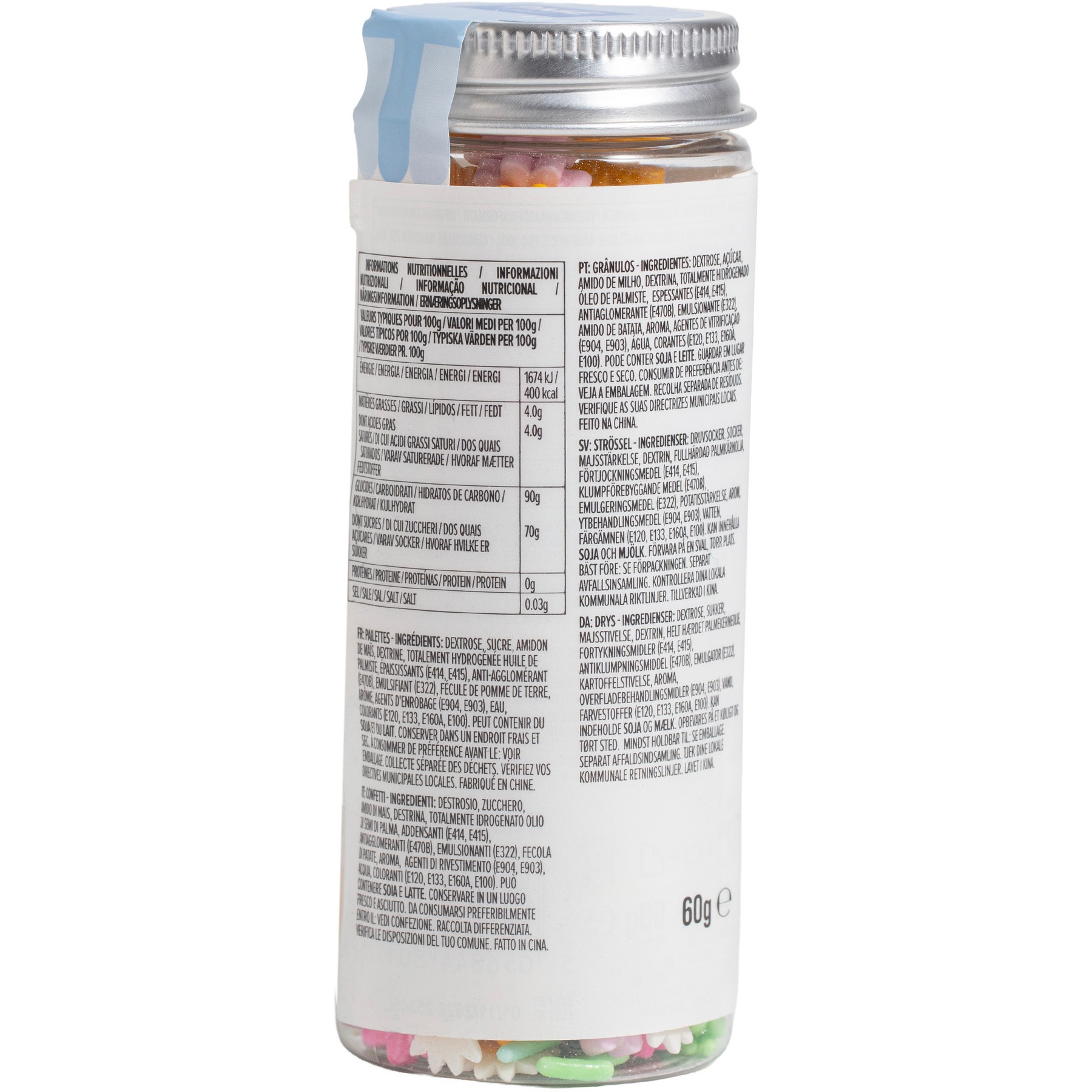 Ingrédients: sucre, amidon de maïs, huile de palmiste totalement hydrogénée, dextrine, émulsifiant (E322), amidon de pomme de terre, épaississant (E415), agents d'enrobage (E904, E903), eau, colorants (E160A, E100, E133, E120).