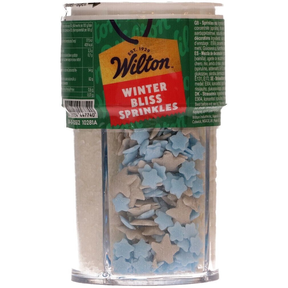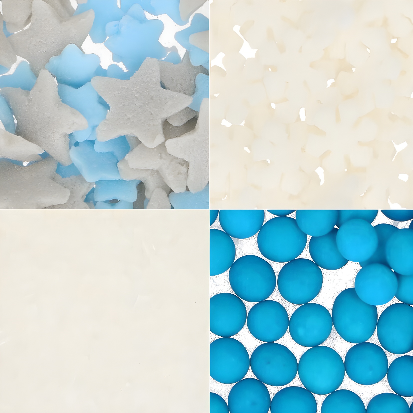 • Cristaux de sucre blancs, flocons de neige blancs, étoiles bleues et argentées, perles bleues.