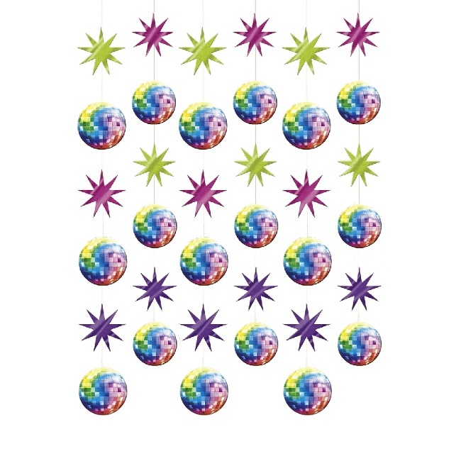Pièces décoratives à suspendre, avec 6 guirlandes qui combinent des boules de disque colorées avec des étoiles assorties en vert, fuchsia et lilas.