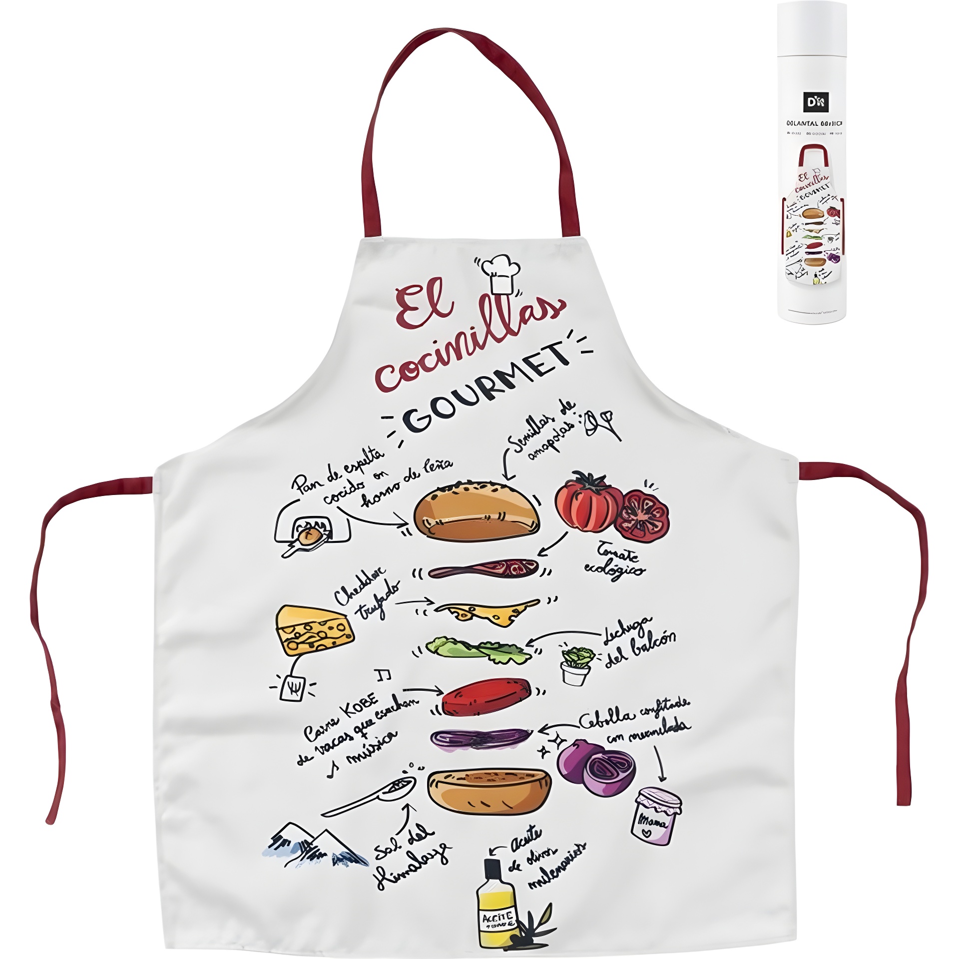 Tablier enfant ludique, imprimé d'une recette de burger de style gourmet, conçu pour inspirer vos petits cuisiniers. Le motif présente clairement les ingrédients et l'ordre de montage, favorisant l'apprentissage pendant le jeu.