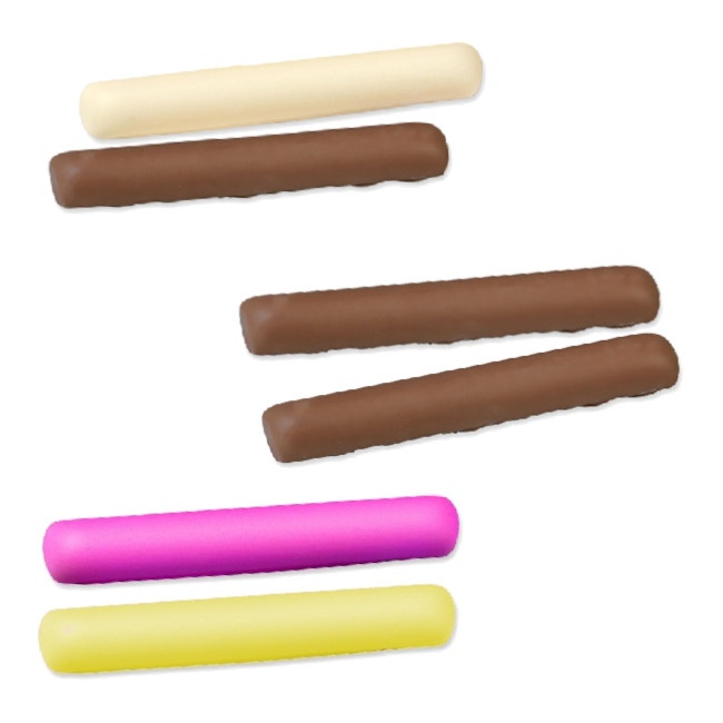 Ingrédients noir et blanc: Enrobage de substitut de chocolat (sucre, graisse végétale hydrogénée (palme), poudre de cacao dégraissé, émulsifiants : lécithine de tournesol, E492, arômes, sirop de glucose et de fructose, sucre, eau, gélatine, humectant : E420, arômes. Peut contenir des traces de noix et de soja.