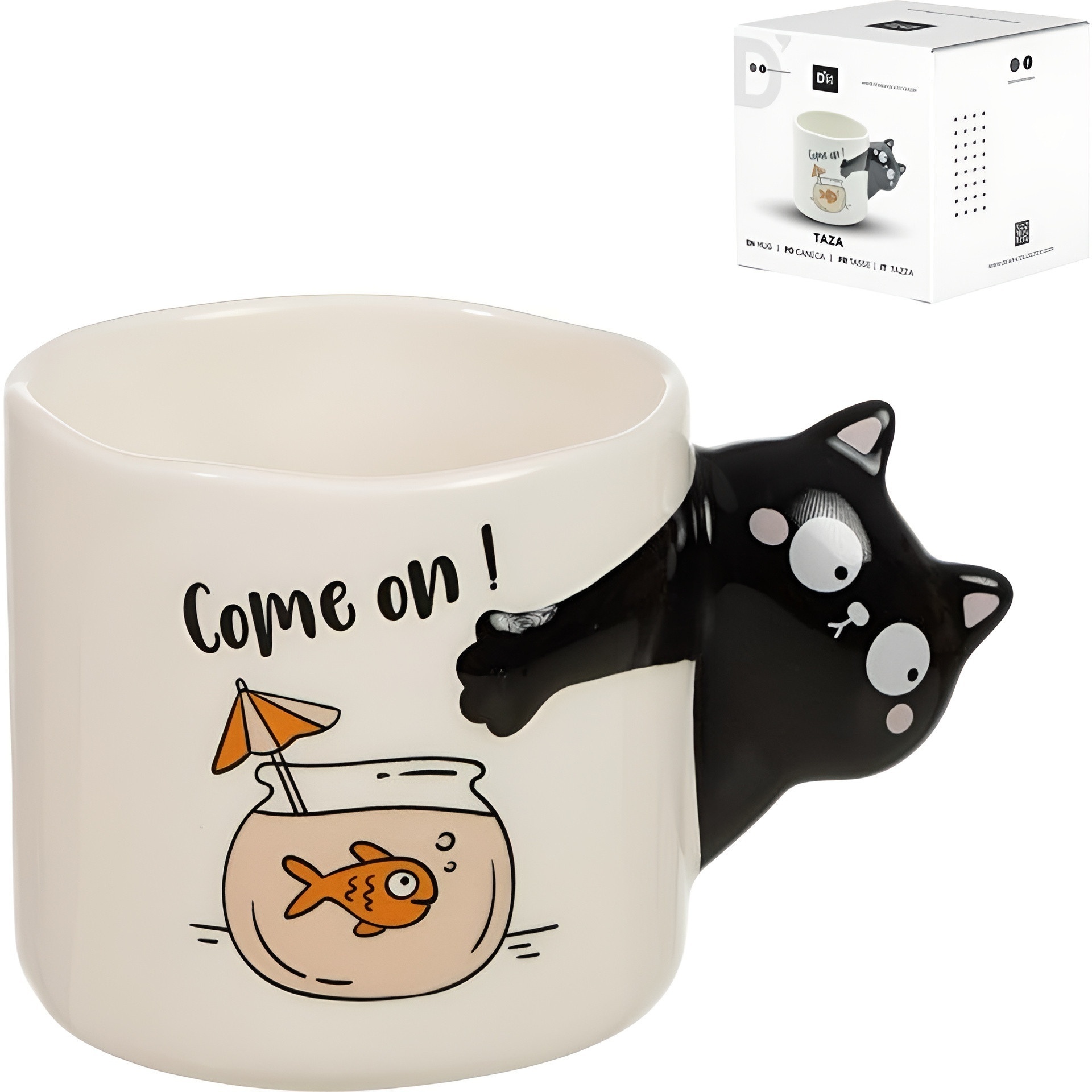 Tasse à anse en forme de chat conçue pour apporter une touche ludique et de la personnalité à vos boissons quotidiennes. L'illustration d'un poisson dans un bocal et le texte "Come on!" font de cette pièce un détail sympathique et original. Capacité de 460 ml, parfaite pour le café, le thé ou le chocolat chaud. Pensée pour décorer autant que pour être appréciée chez vous ou au bureau, c'est une idée cadeau facile à réussir pour tout amateur de chats.