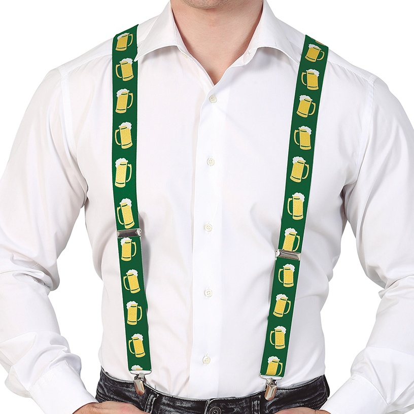 Ces bretelles élastiques se distinguent par leur couleur verte avec des ornements de chopes de bière. Elles peuvent être facilement ajustées et sont recommandées pour les adultes.