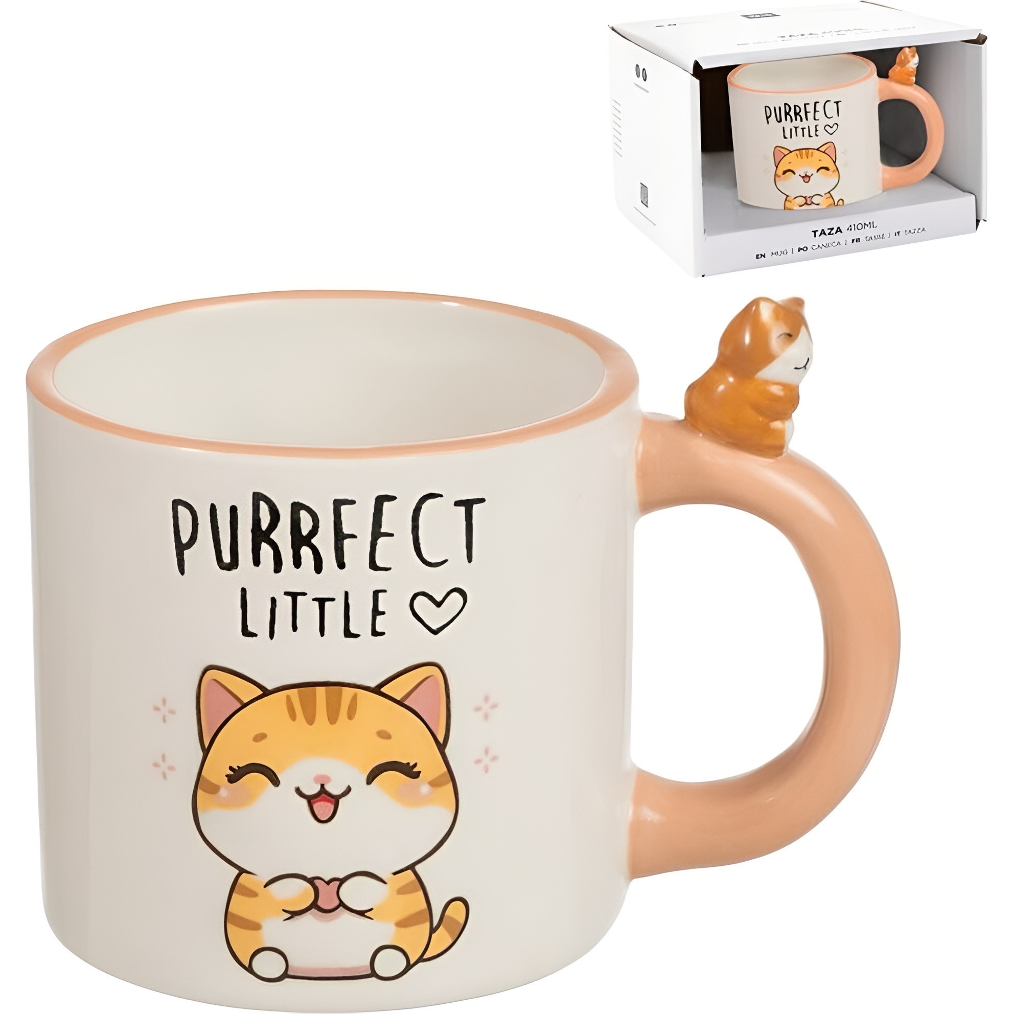 Tasse au design kawaii représentant un chaton, équipée d'une petite figurine décorative sur l'anse qui la rend unique et charmante.