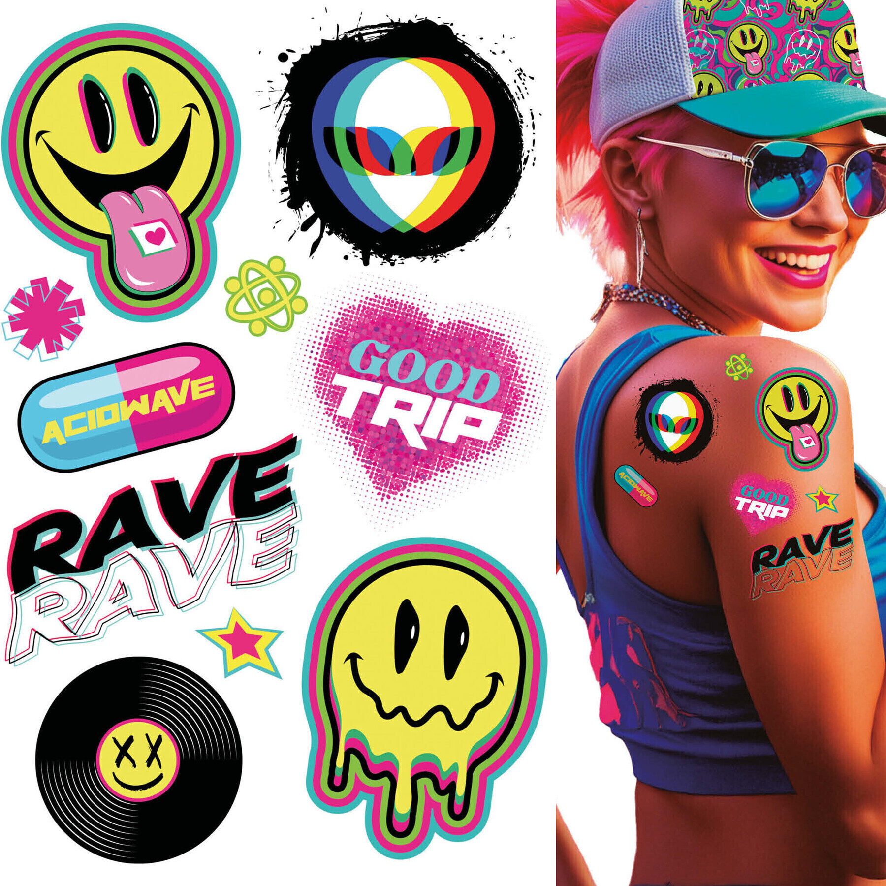 - Feuille de tatouages assortis - motifs néon et « rave », idéaux pour festivals et soirées.