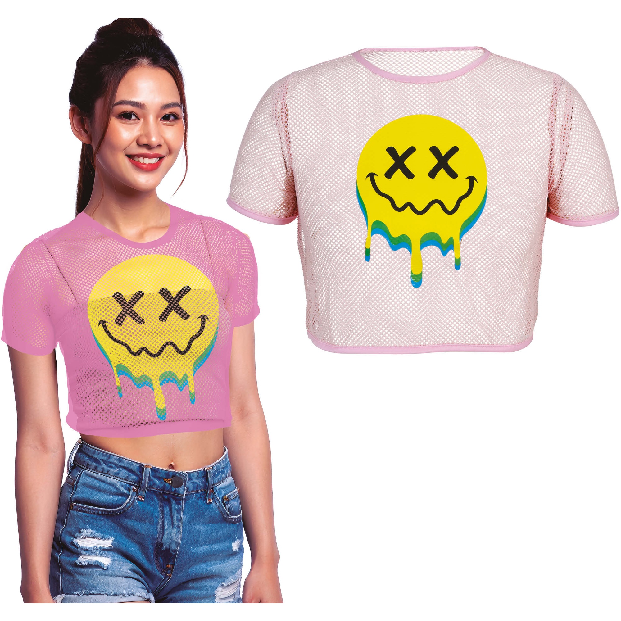 Crop top en résille au design acid avec un imprimé smiley mettant en valeur un effet dripping. Tissu en polyester léger et respirant, pour un porté audacieux et confortable. Coupe courte et silhouette décontractée, pensée pour se porter avec des tops, des bralettes ou en couche supérieure.