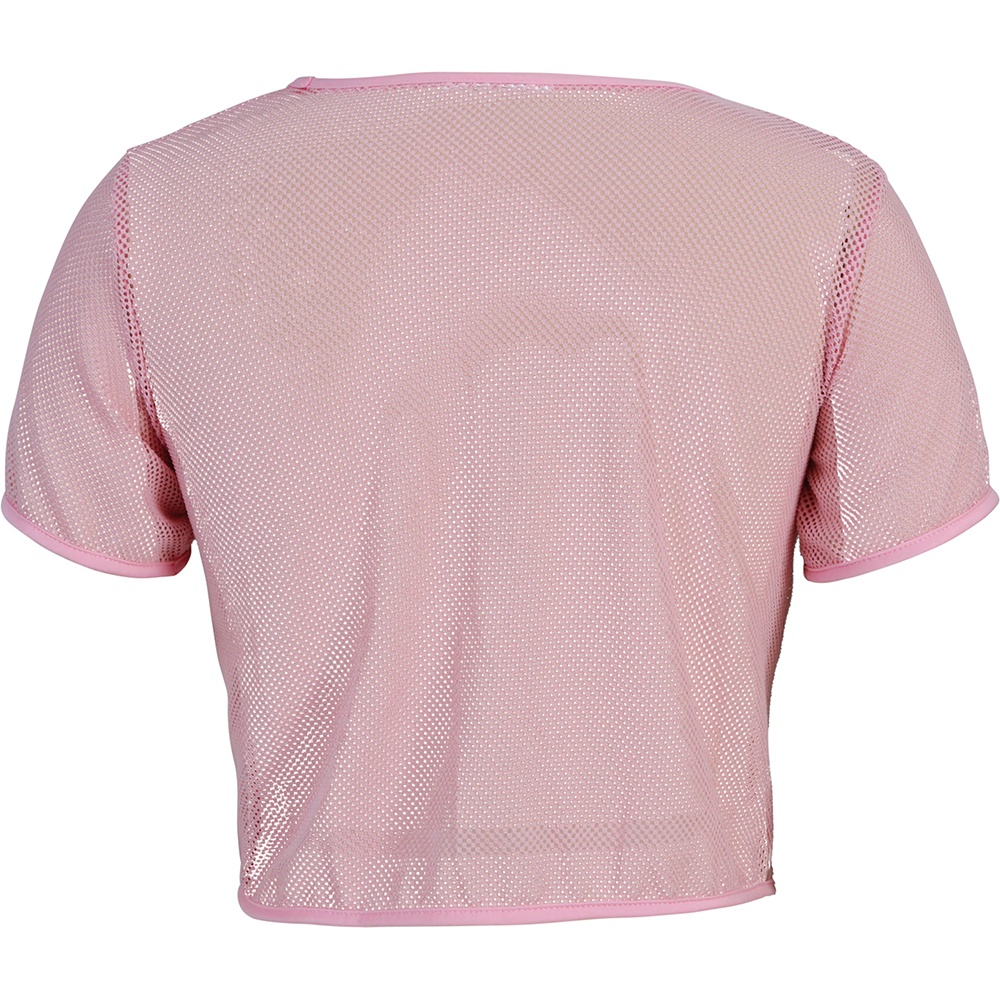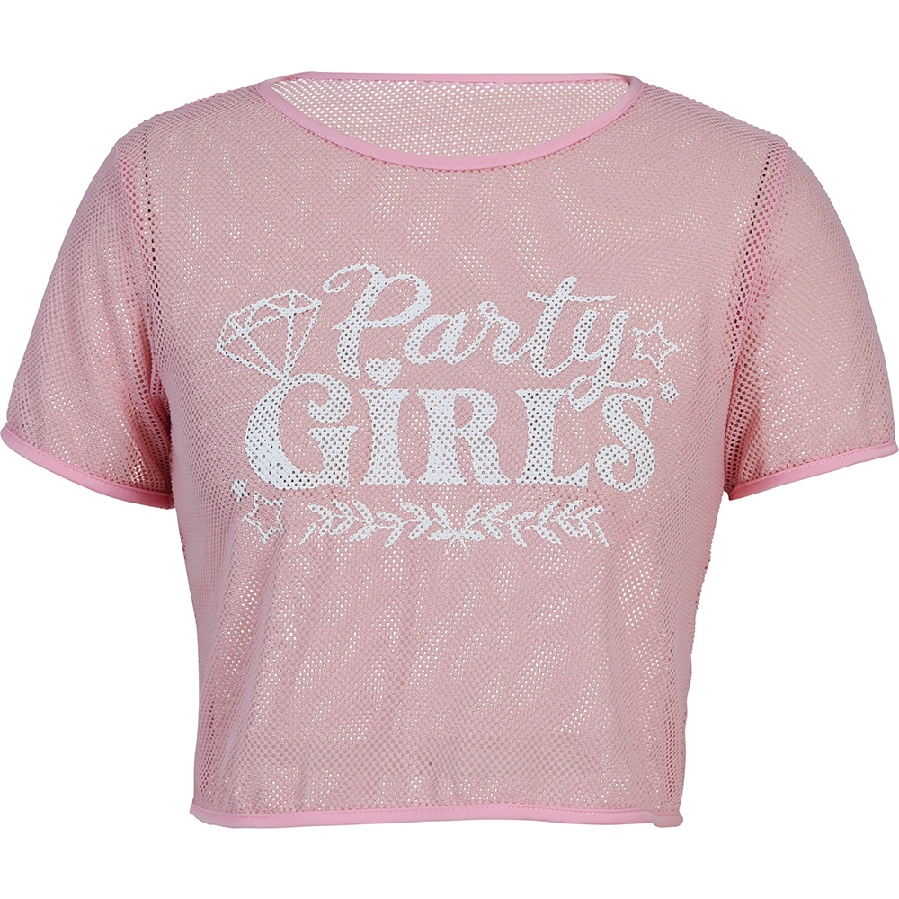• Top court en résille rose, imprimé "Party Girls", pour un look festif et féminin.