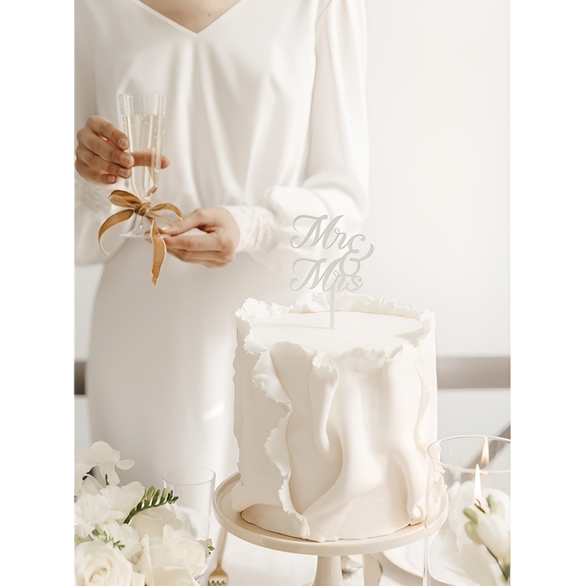 Topper de gâteau MR & MRS en acrylique blanc, qui apporte une touche élégante et romantique à la décoration de mariage. Son design calligraphique et sa finition polie subliment tous les gâteaux, créant un point focal sophistiqué.