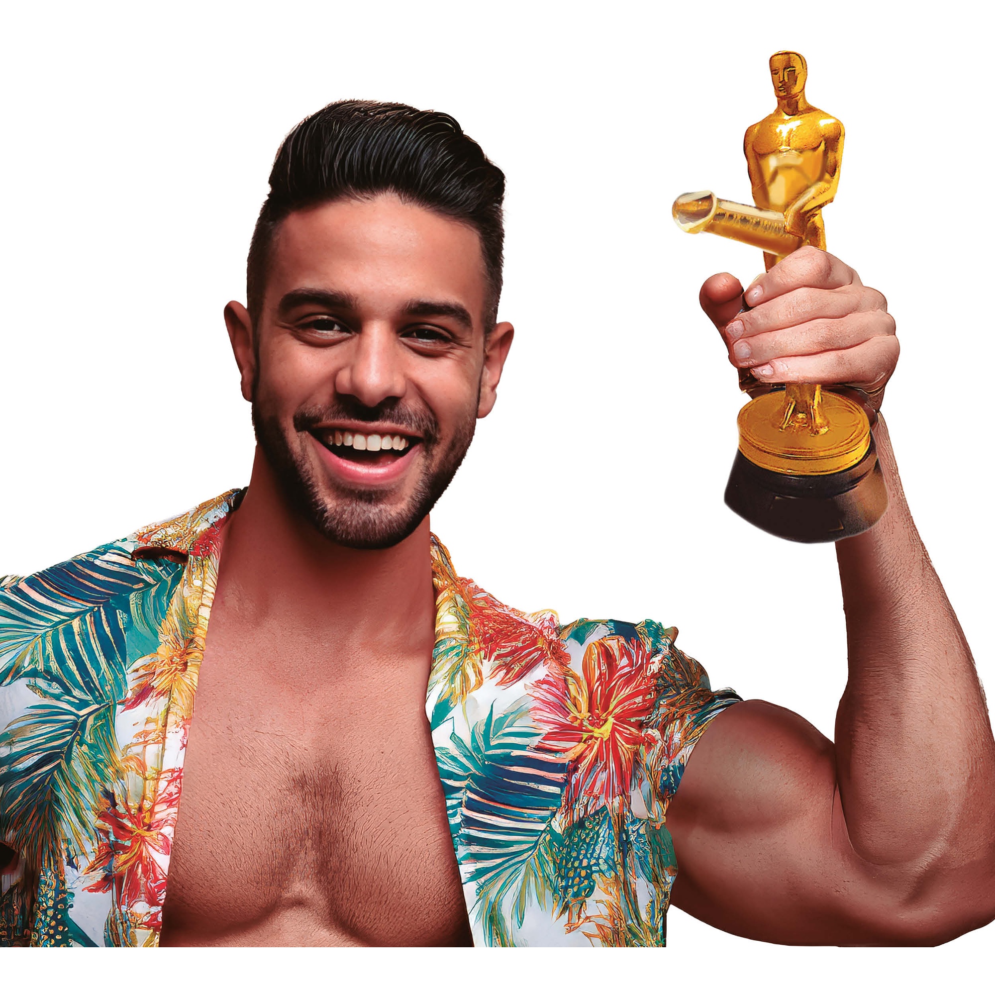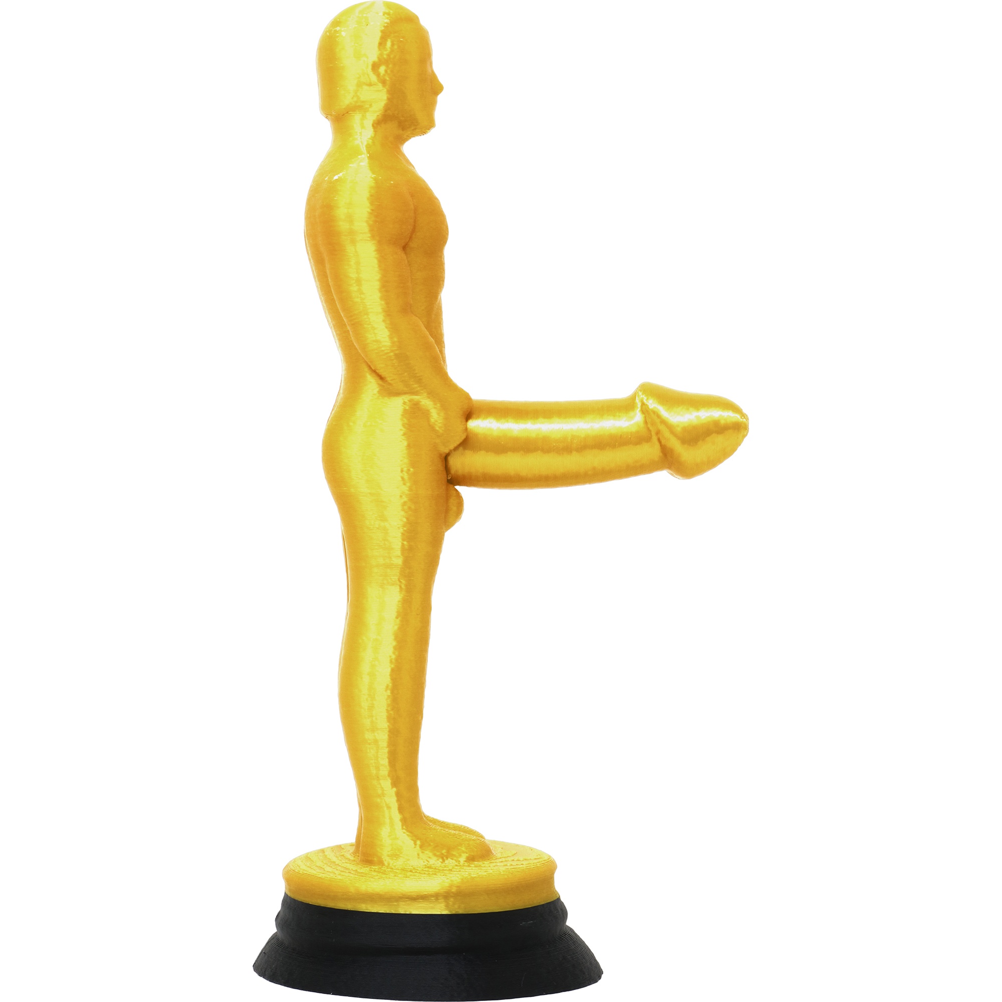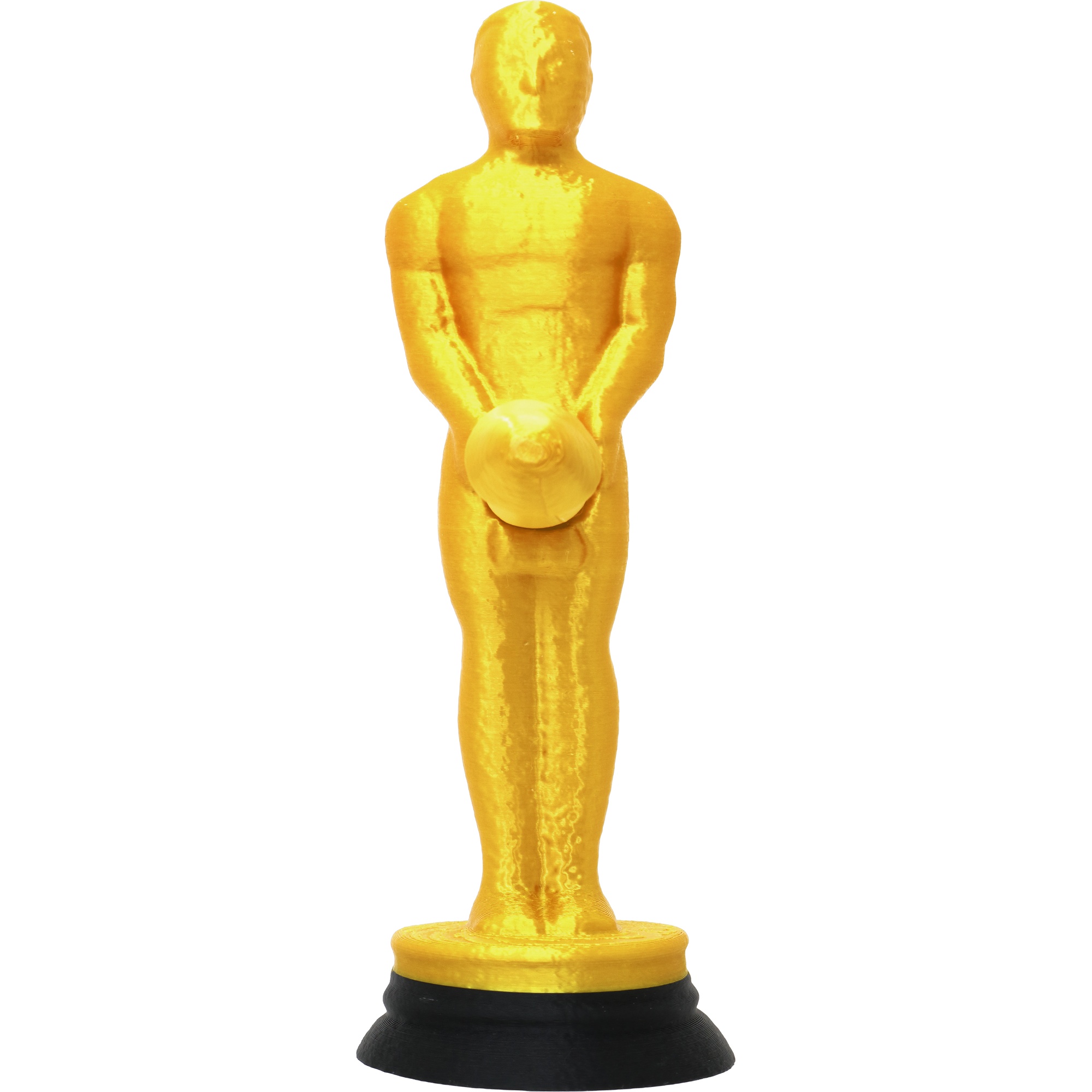 Statuette de 20 cm en PVC, finition dorée brillante et socle stable. Légère et résistante, elle se prête aussi bien à une remise en tant que gag qu'à une décoration.