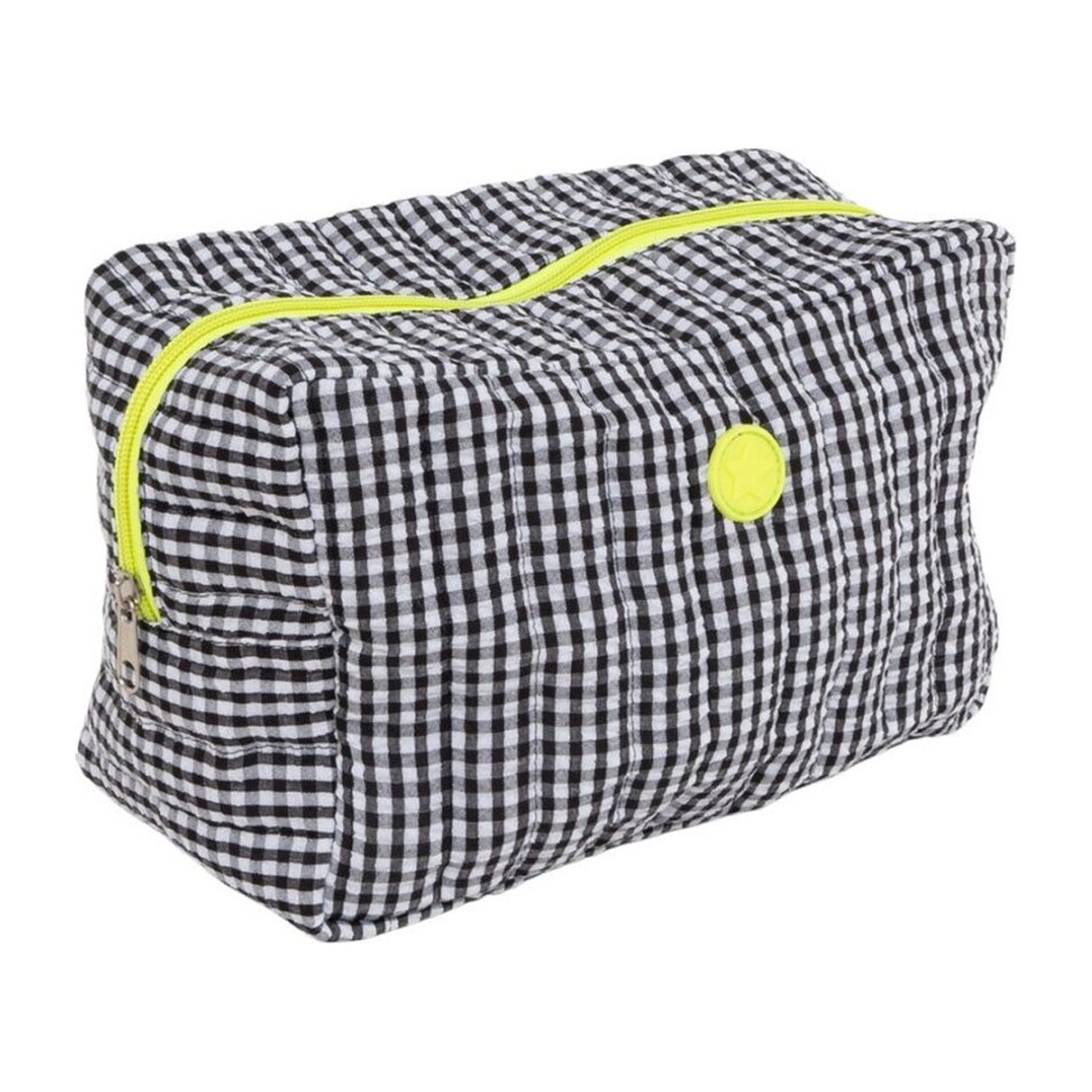 Trousse au motif vichy noir et blanc, associée à une fermeture éclair fluo qui lui confère une touche moderne et remarquée. Conception spacieuse et rectangulaire pensée pour organiser vos cosmétiques et accessoires facilement. Légère et polyvalente, elle s'accorde avec tous les bagages et vous accompagne au quotidien comme en voyage.